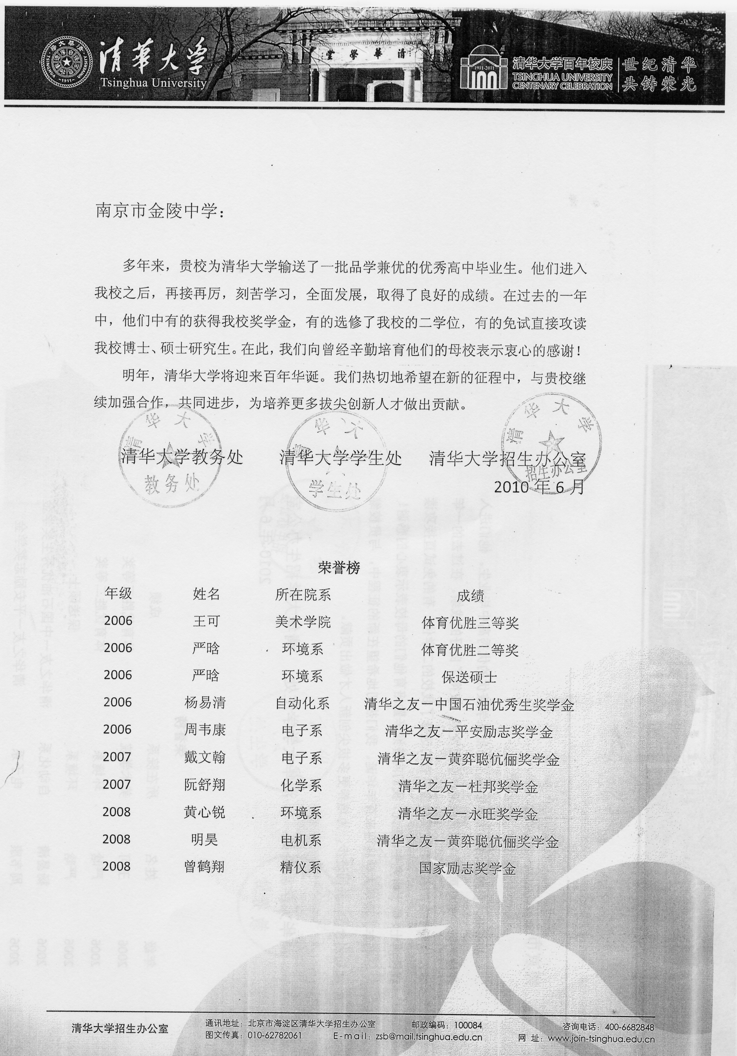 清华大学寄来我校往届优秀学生荣获奖学金喜报