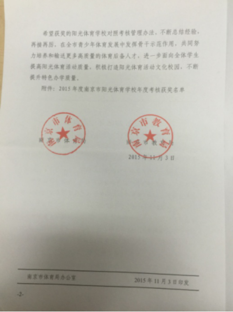 2015年度,经教育局、体育局实地抽查调研和审查自评材料,我校被认定在队伍建设(含招生)、活动质量、保障措施、输送成绩、运动成绩(含赛风赛纪)等方面工作突出,荣获2015年度南京市阳光体育学校考核一等奖的可喜成绩,特此通告,表示祝贺!