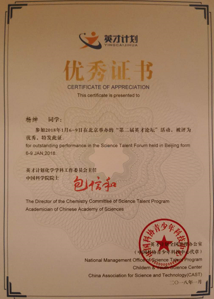 2018年1月6日至8日,第二届英才论坛在北京中国科技会堂举行。江苏省英才计划管理委员会和南京大学结合导师评价、中学意见及学生申报材料共同对报名学生进行联合推荐,最终遴选出4名同学参加本次论坛,我校高二年级杨绅、于达蔚两名同学成功入选。经过成果展示和专家评议,杨绅同学荣获2017年“英才计划优秀学员”称号。来自21个省、市、自治区的100多名“英才计划”学员参加了本次活动。