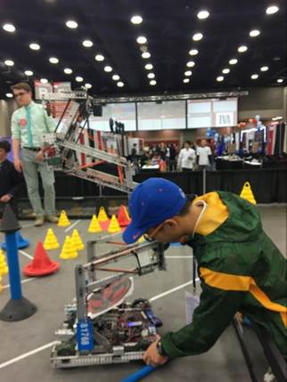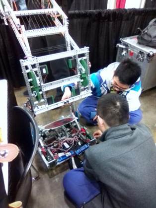 经过13个小时的飞机和5个小时的大巴的长途跋涉,我们顺利到达了路易斯维尔的比赛场馆,将金中机器人社社旗挂在了准备区,学生开始在准备区进行紧张的结构调试。
