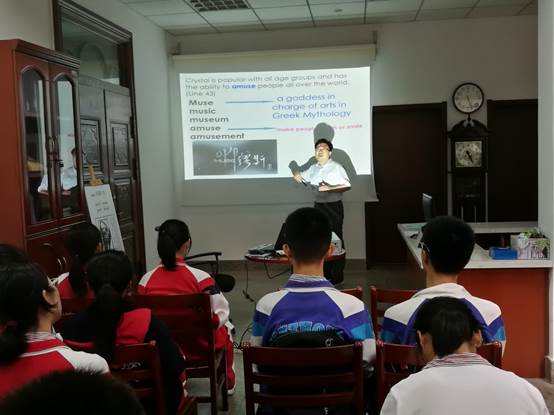 5月31日下午5:15-6:15,我校英语老师程从兵在图书馆借还书大厅以《文化中的单词 单词中的文化-----解密单词文化基因》为题,和高一高二高三同学们分享了记忆单词、学习英语、领悟语言文化的心得。程老师以独特的视角,高屋建瓴,从“基因文化、古希腊神话、宗教文化、恋爱婚姻文化、政治文化、化学文化、物理学文化、数学文化、天文学文化、地理文化、佛教文化、历史文化、饮食文化、住宅文化、韵律文化、英雄文化、经济文化、工业文化、健康文化”等方面阐述了英语单词蕴含的文化内涵,提供了记忆单词的有效方法,拓宽了同学们英语学习的视野。程老师学识广博,表达风趣幽默,又多和同学们互动,这使本次沙龙气氛轻松愉快,也使同学们收获颇多。