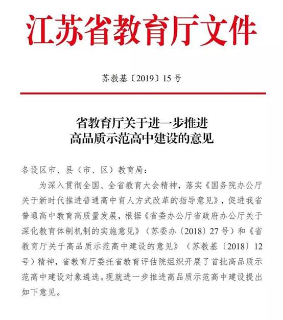 江苏省高品质示范高中建设是我省普通高中教育在星级评估基础上创设的引领性发展项目,是顺应高中教育改革趋势、助推高中教育品质提升的重要工程,是适应教育强省建设、提高我省教育持续竞争力的创新探索,是回应人民教育关切、实现普通高中育人方式改革和高质量发展的重大举措。