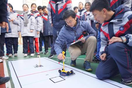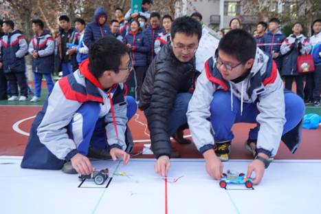 各组队员们兴奋地捧着自己设计的小车入场比赛,警戒线外的同学们也早已按捺不住激动的心。随着裁判哨音的吹响,欢呼声、呐喊声、加油声瞬间充斥着整个赛场,响彻云霄、震耳欲聋,鼓舞着在场的每一个队员、震撼着每一个围观的同学和老师。