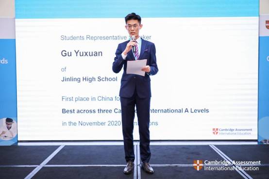 2021年5月21日,2021“CAIE剑桥卓越学子”奖颁奖典礼在上海花园饭店举行。金陵中学国际部剑桥班2021届毕业生顾宇轩同学荣获CAIE Outstanding Cambridge Learner Awards-Best Across Award,并作为获奖代表致辞。