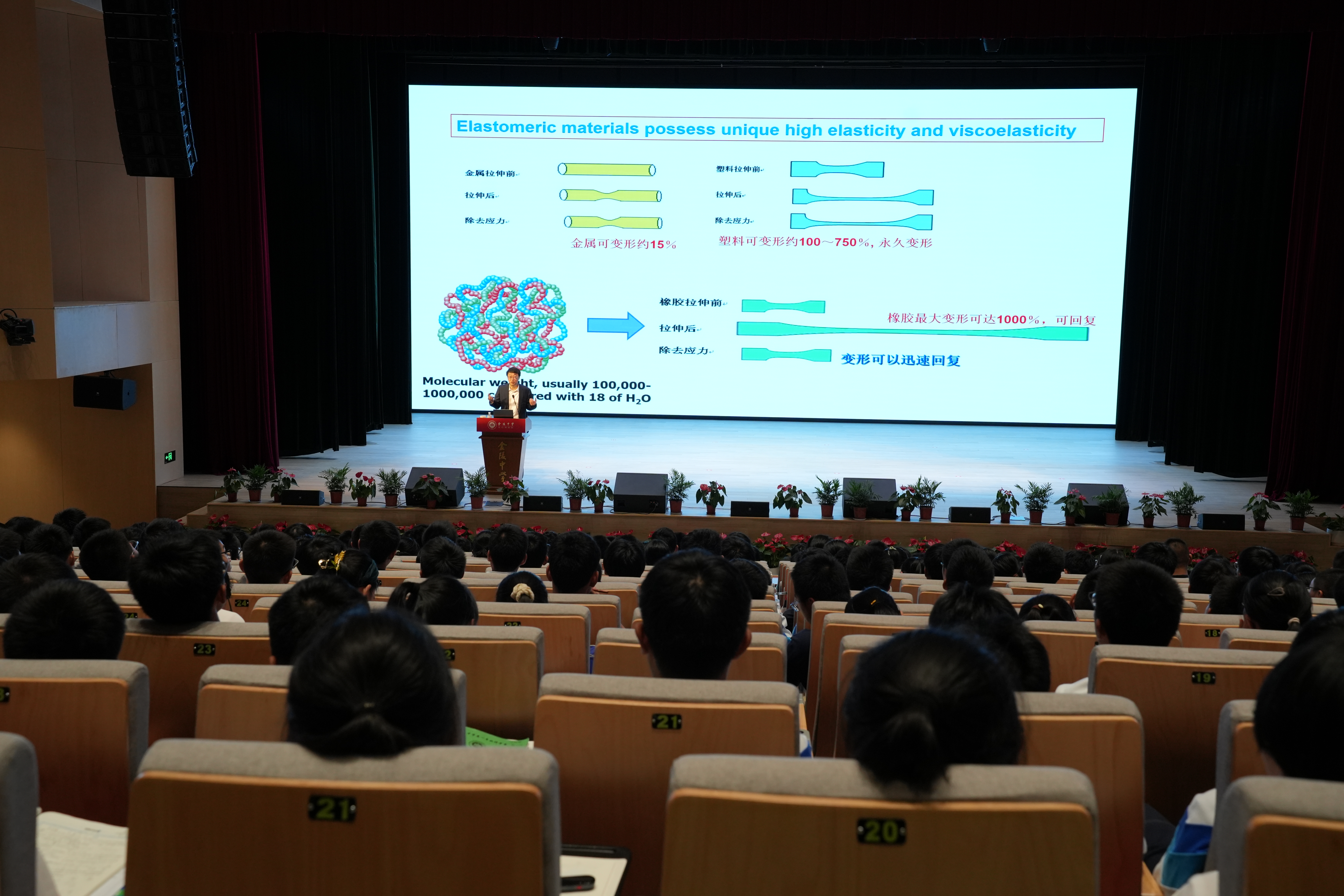 在随后进行的院士讲座中,张立群校长以《汽车用新一代绿色橡胶材料》为主题,向金中江心洲校区的同学们介绍橡胶材料发展的基础问题和实际应用等前沿领域科学问题。在他的展示下,同学们意识到原来生活中不起眼的橡胶竟然有这么大的作用——橡胶不仅关系到航空器的安全,也是未来人形机器人仿生皮肤的重要材料。此外,他还和同学们回忆起了自己年少时条件艰苦的求学经历,勉励同学们早日树立理想目标并为之努力奋斗,并欢迎同学们三年之后能够报考华南理工大学,一起投身于祖国的建设发展中。