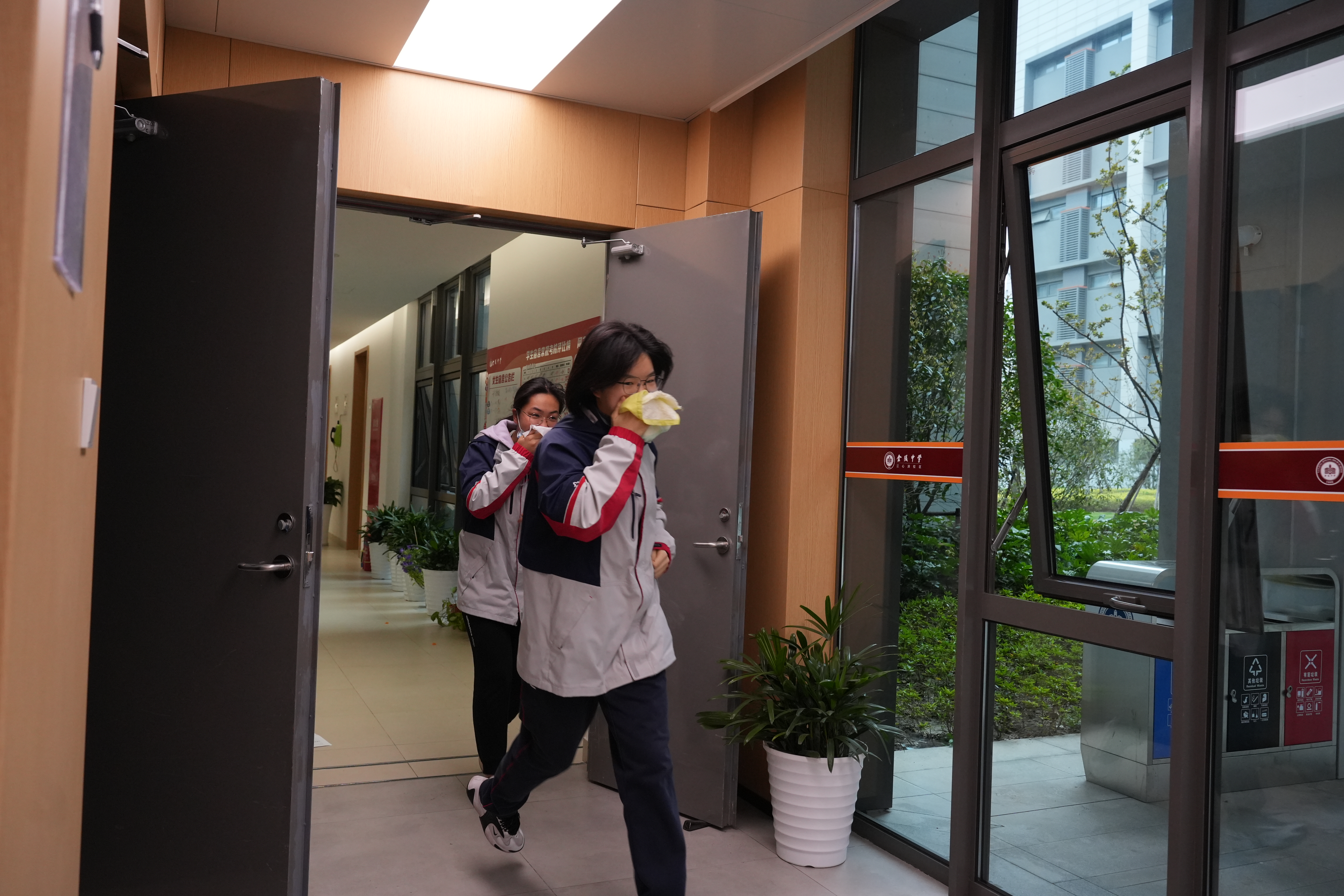 随着消防警报响起,消防应急演练活动正式拉开了帷幕。全体生活老师严格按照学校制定的安全疏散预案,及时进行疏散,学生们按照指定路线,弯腰低头,用毛巾捂住口鼻,迅速有序地疏散撤离到校园内空旷地带,整个演练过程井然有序。