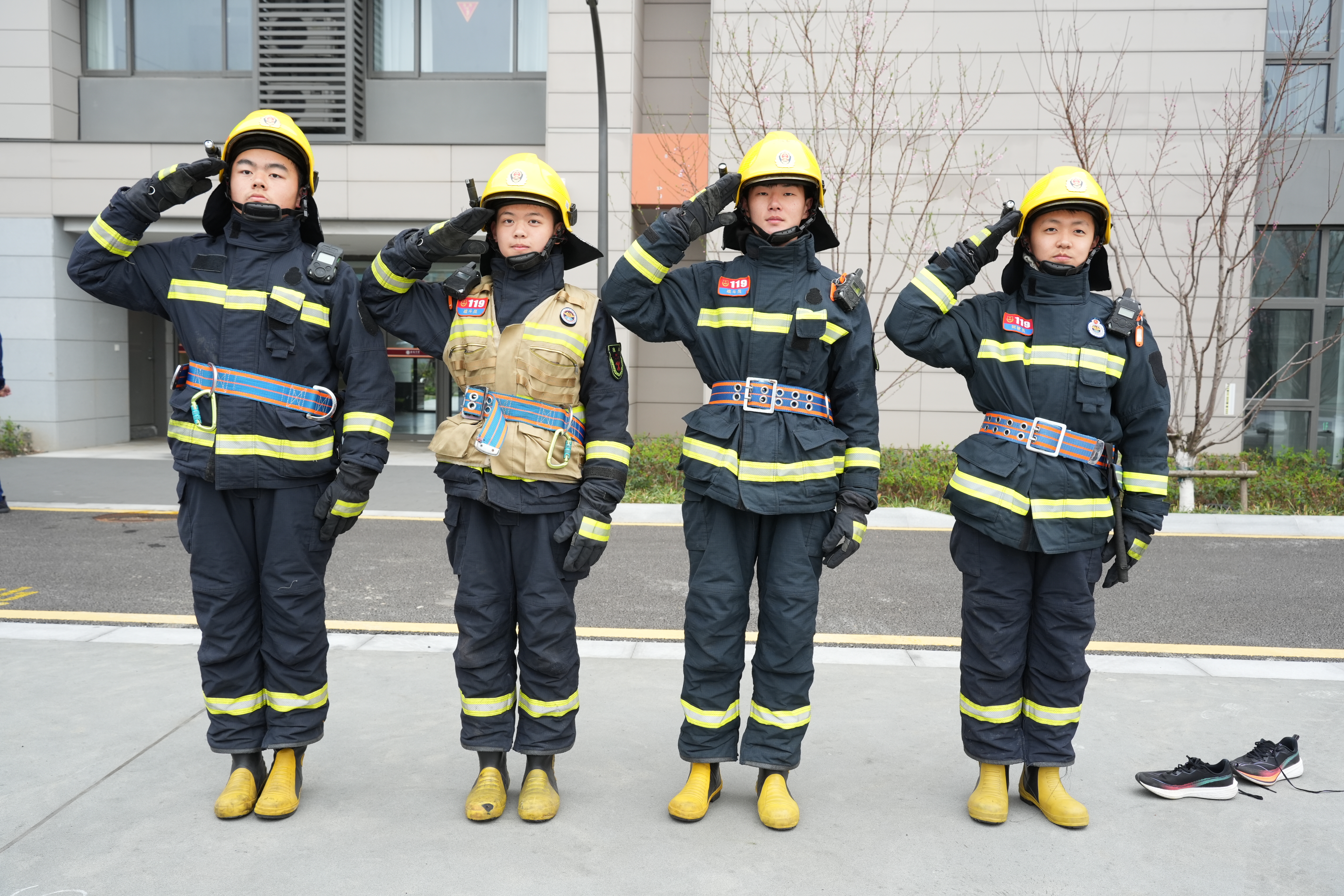 套入鞋裤,戴上阻燃头套,穿上外套,系上安全腰带,最后戴上灭火头盔和消防手套……在消防员的指导下,郑锦涵、张庭恺、朱国瑞和王孜琦4名同学沉浸式地体验了一回“火焰蓝”消防员的灭火工作。