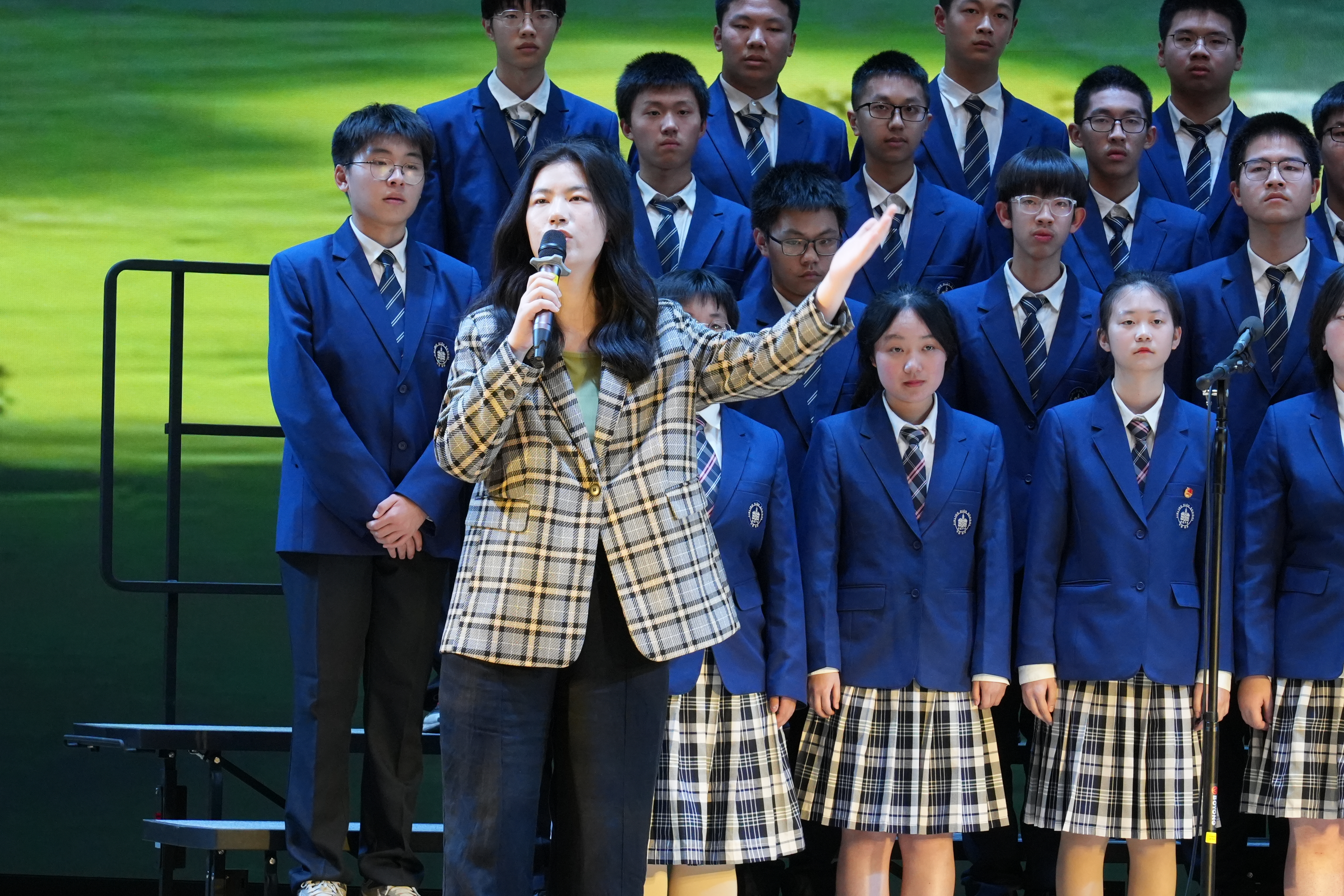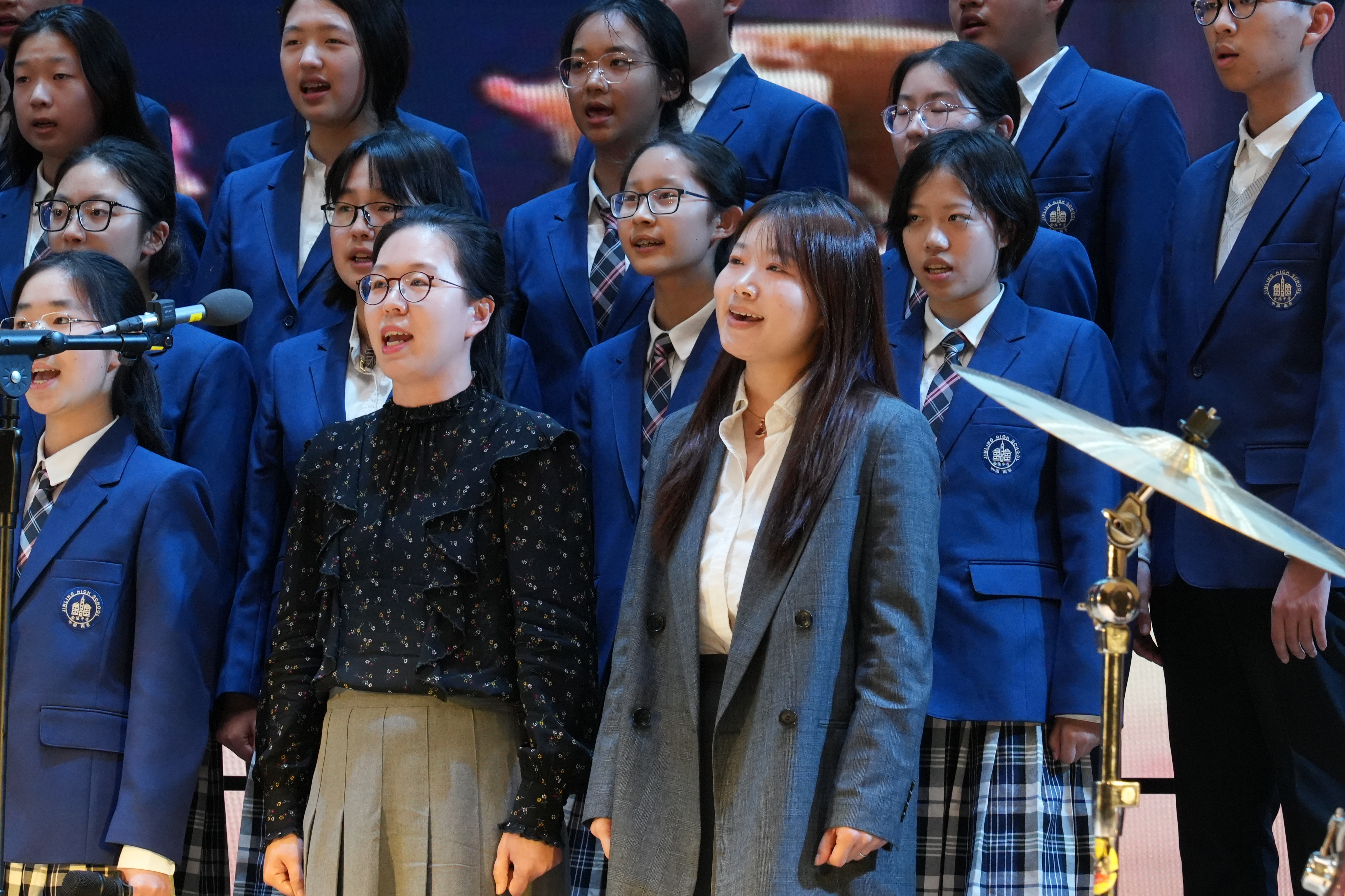“自有玫瑰和星光,也有海洋和远方!”比赛中,高一(15)班在编排中用了很多巧思。他们把金中1996级校友、上海航天技术研究院数字化副总师邹薇的故事融入在大屏中,并邀请班主任殷奇峰老师、化学组江敏老师、体育组李加权老师、数学组黄大洧老师前来助阵,配合着深情、有力的精神面貌和肢体动作编排,赢得了满堂彩。像这样师生同台共唱一首歌的例子比比皆是,大家一起反复打磨,一同为台下观众呈现出最美的视听盛宴。