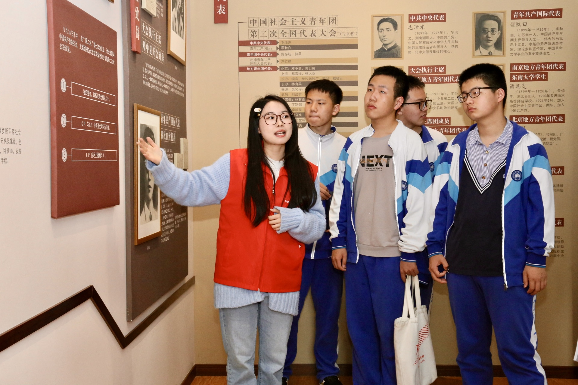 在志愿者的生动讲解中,同学们对梅庵的红色历史和团二大精神认识更加深入。在当天负责讲解的志愿者中,有一位是金陵中学2019届毕业生潘入墨。如今的她,已经是东大生命科学与技术学院23级硕士生,现任生命科学与技术学院23学硕团支部书记、生命科学与技术学院遗传学党支部副书记。在东大校园里看到熟悉的金中校服,看到学弟学妹们朝气蓬勃的面庞,她觉得激动又亲切,“对我来说,在金中度过的三年,是诗意的栖居,是知识的熏陶,是人生中难以忘怀的时光。我倍感荣幸,能用东大青年的声音为金中学子讲述东大悠久的历史。”潘入墨说,作为金陵中学的毕业生,她将继续带着“诚真勤仁”的金中烙印,用自己的声音传递青春力量。