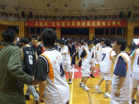 最后,到场的各校领导向本次活动中获奖的教练、个人、集体颁奖。我校男子篮球队由张锦老师担任教练,10月份组队,作为一支年轻的队伍,此次取得了不错的成绩,获“最佳校园风采奖”,殷辰昊同学获最佳运动员。邹正校长为冠军队南师附中队颁奖并讲话,他认为此次篮球联赛加强了名校间的交流,为南京市校际间的体育交流作了很好的示范。他希望同学们坚持体育锻炼,在锻炼中培养起坚强的意志,在比赛中形成团结友爱的品质,展现中学生一往无前的精神风貌。最后邹正校长宣布2008年南京市“名校杯”中学生篮球联赛圆满闭幕。