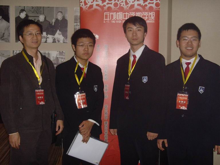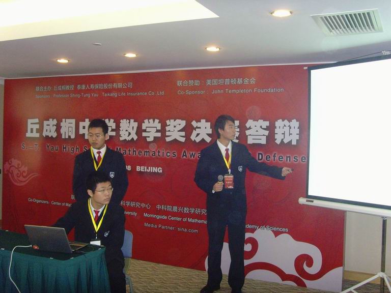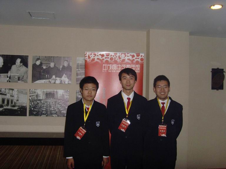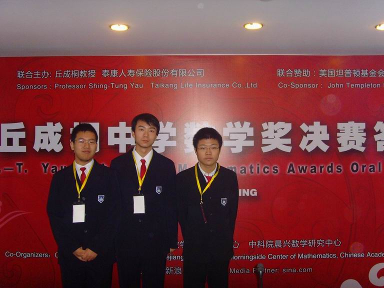 在凌惠明老师的带领下,高三年级叶天扬、王明苑、魏博三位同学参加了在北京举行的由全球华人中学生参加的首届丘成桐中学数学奖总决赛。参加总决赛的学生将对所写的论文进行英文答辩,评委由世界知名大学的专家组成,经过激烈的角逐,取得了赛区一等奖的好成绩。
