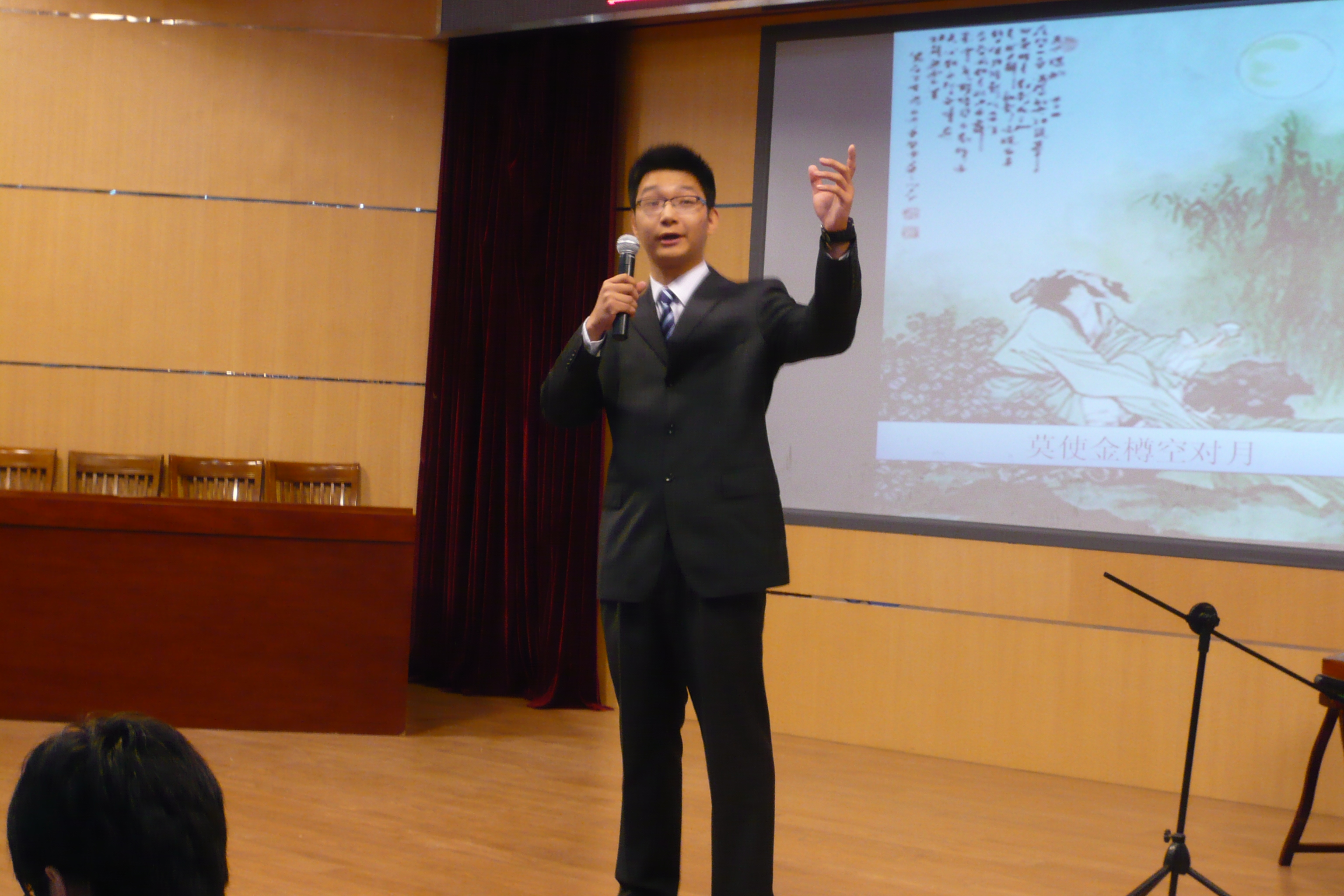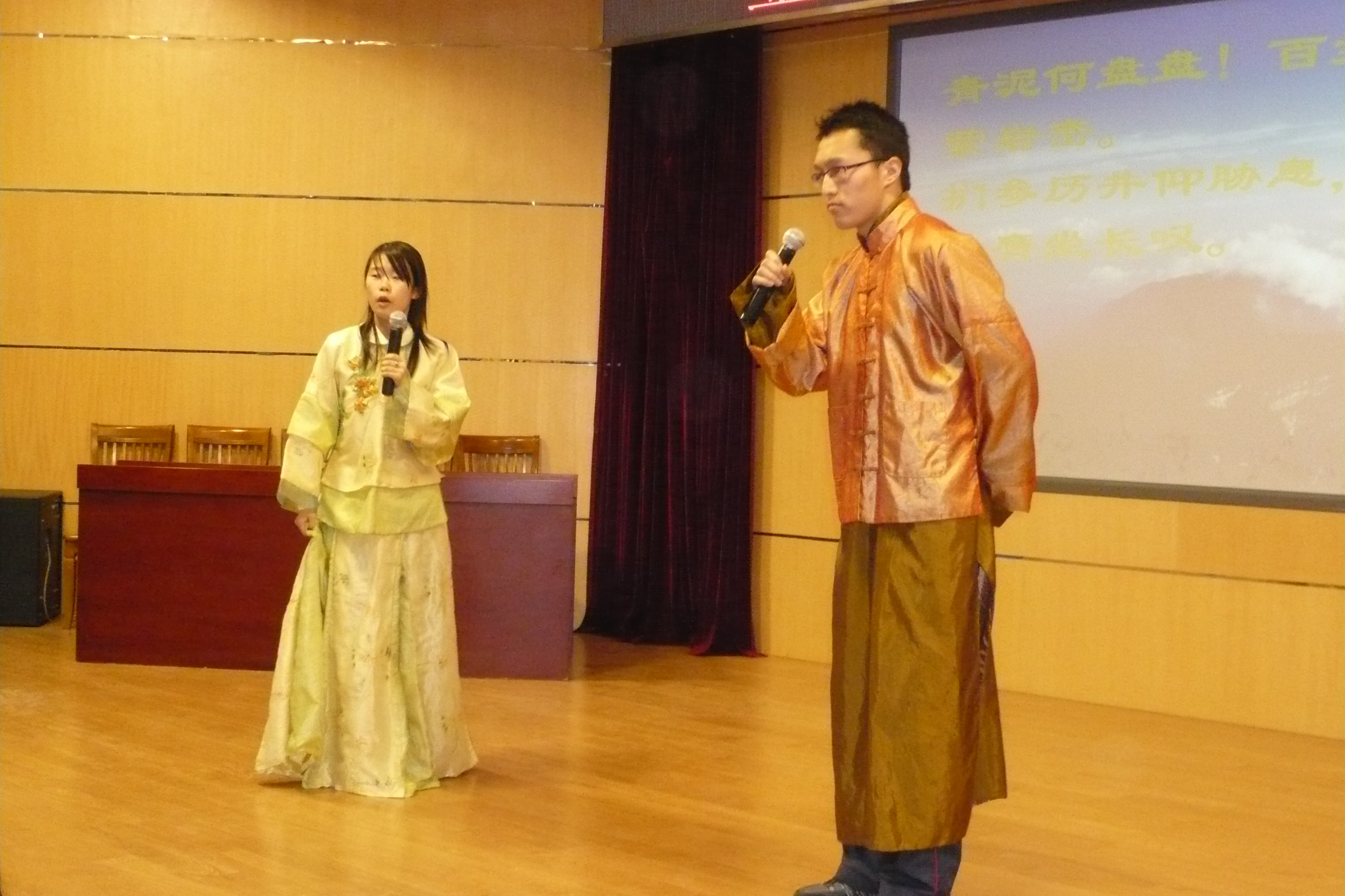 2011年10月20日下午,金陵中学第二届“金钟杯”诗文朗诵比赛在科学馆报告厅隆重举行。高二年级十四个班,近700人参加了该项活动。本次比赛的参赛篇目全为古典诗文,有李白的豪情天纵,也有柳永的婉约深情,有林妹妹的绝尘弃世,也有林觉民的家国难忘,更有岳武穆、梁任公、孙中山先生的拳拳救国之心。参赛选手领会古仁人之心,展现青春风采,或激情或深情的表演,感染了在场的每个同学。比赛结束前,王鼎宏老师也用诗朗诵的方式对全场比赛做了总结点评,再次掀起高潮。在金陵中学学生工作处与语文教研组共同组织筹划下,古诗文朗诵比赛获得了圆满成功。