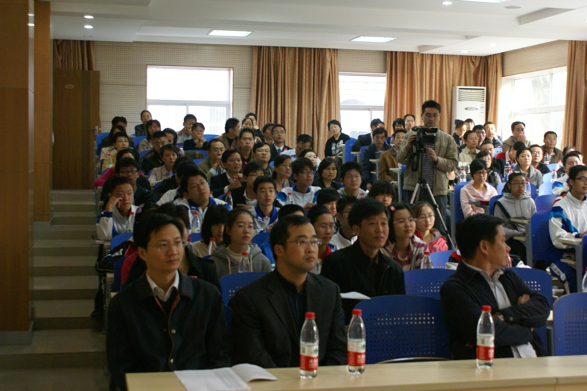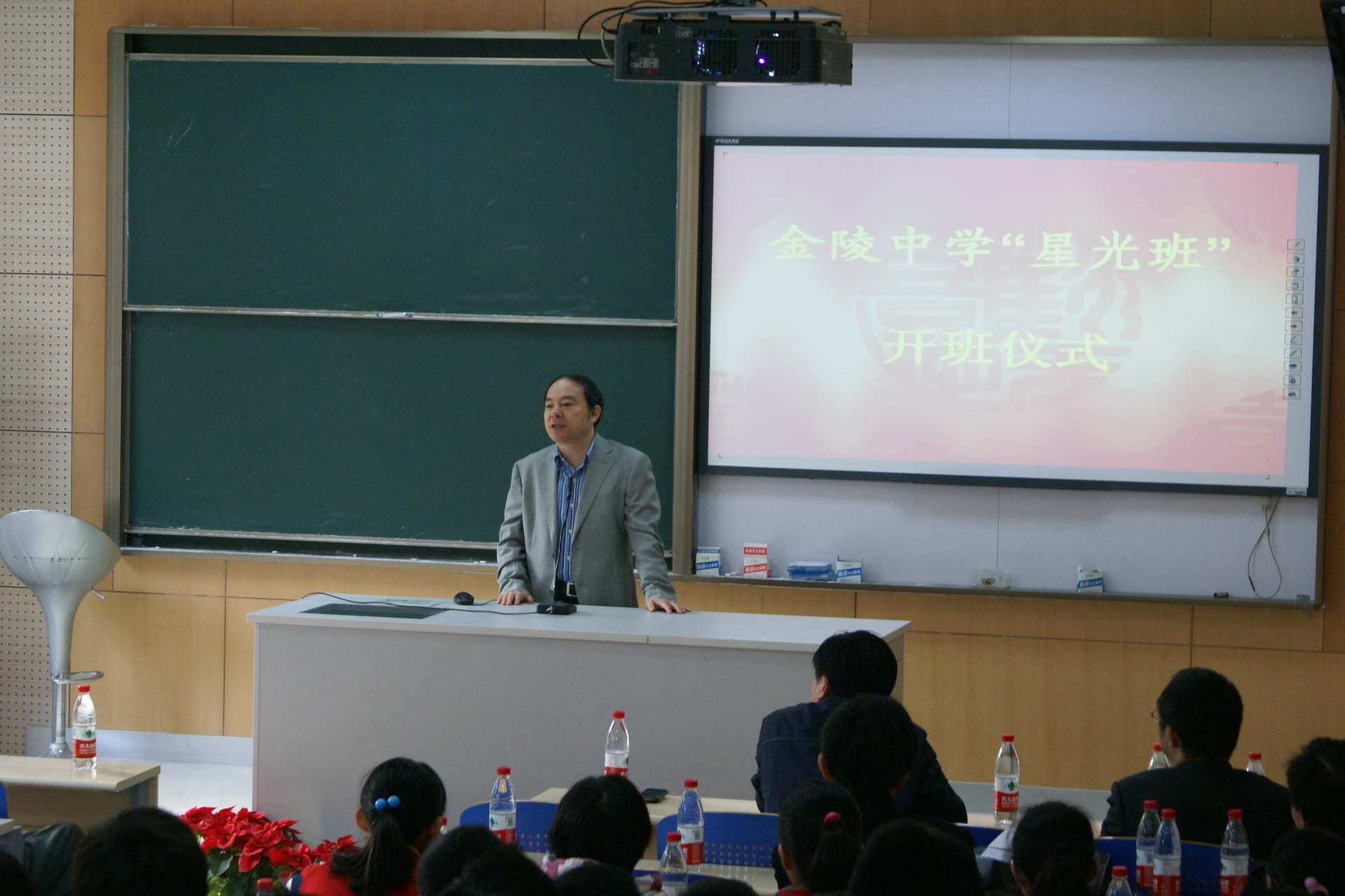 为了切实落实全国以及江苏省2010-2020教育规划纲要,实施素质教育,积极培养创新人才,我校于2010年10月16日成立了“星光班”,作为南京市首批星光基地学校,为推进南京市星光计划的实施贡献力量,为全市学生提供学习平台和优质学习资源。16日上午8:00我校“星光班”开班仪式在101阶梯教室举行,来自金陵中学河西分校和汇文初中初三年级的44位同学及其家长齐聚一堂,为如何真正推进“星光计划”积极讨论。进入“星光班”活动的同学在学校均表现优异,有着扎实的学习基础和出众的学习能力,尤其是在创新活动上兴趣浓厚。开班仪式上,邹正校长阐释了金陵中学 “为学生一生奠基,对民族未来负责”的办学理念,介绍了我校的办学特色,勉励大家认真学习,努力成为身心健康、人格独立、成绩优秀的学生,也相信每一位同学的未来都会璀璨夺目。清华大学博士生导师、全国霍英东青年教师科研奖获得者、建筑环境与工程设备研究所副所长、我校80级校友张寅平博士在开班仪式上激情发言,感谢母校的培育之恩,回忆起当年母校的岳燕宁、杨祖恒、脱新祥多位老师对他的谆谆教诲,他们的人格魅力、学识魅力都对他影响巨大,使他受益终生,他鼓励在场的每一位同学珍惜在金中的学习机会,锻炼自己各方面能力,全面发展。喻旭初老师的发言语重心长、激情澎湃,勉励大家把自己锻造成为具有“丰富的知识、开阔的视野、创新的思维、独立的精神、自由的思想”的金中学子。随后,星光班的同学和家长还参观了学校数字化生物实验室,科技作品室、模型工作室、机器人工作室、纸文化工作室,同学们兴趣浓厚,积极体验了造纸过程,观摩机器人比赛等,整个活动有趣而充实。最后,教学部门介绍了星光班(一期)的活动安排和未来规划。参加开班仪式的还有蒋桂林副校长,汇文中学校长助理张爱平老师、江苏省特级教师徐锐老师、全国数学奥林匹克竞赛高级教练凌惠明老师、语文教研组副组长蒋薇老师、教学处朱焱主任、戴喜副主任,教学保障处徐沂主任、翁德强副主任,会议由朱焱老师主持。 (教学工作处)