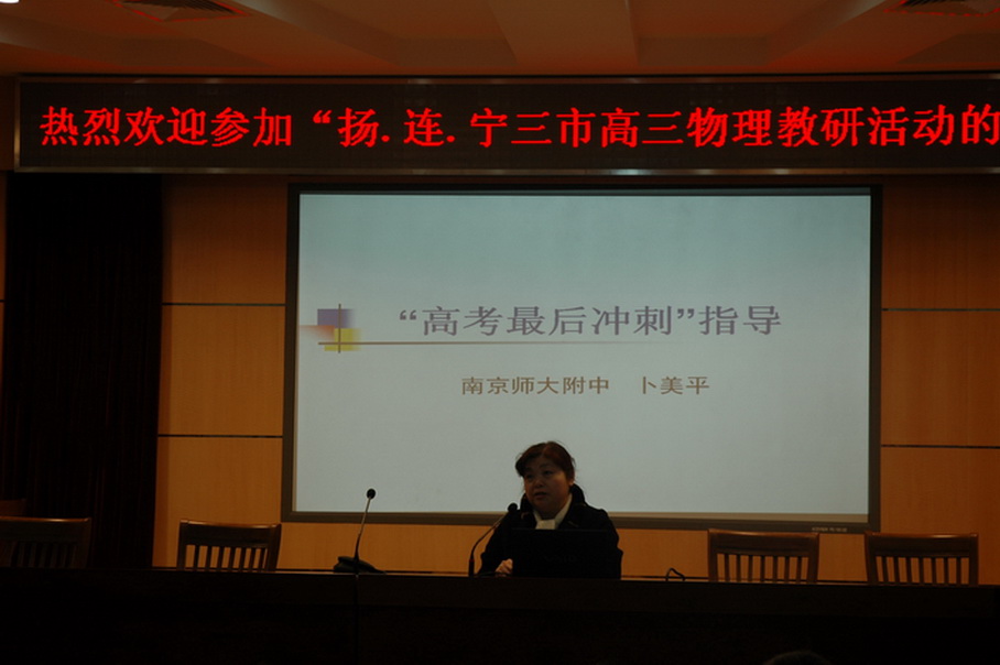 今天,由南京市教学研究室主办的“扬、连、宁三市高三物理联合教研活动”在我校举行。上午第二第三节课,分别由我校特级教师陈连余老师,扬州新华中学李庆国老师同时开课,课题为“高三“二轮”专题复习----图像专题”;南师大附中陈锋老师和东海高级中学孙宜好老师同时开课,课题为“高三‘二轮’专题复习----数学方法专题”。