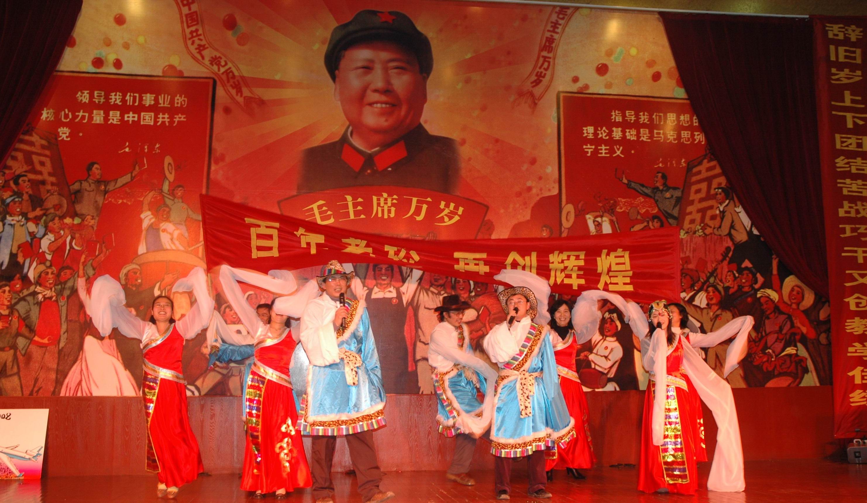 金陵中学教工迎元旦晚会举行于火红岁月大酒店,看戌装劲舞,小将威风,追忆当年,感慨成诗。