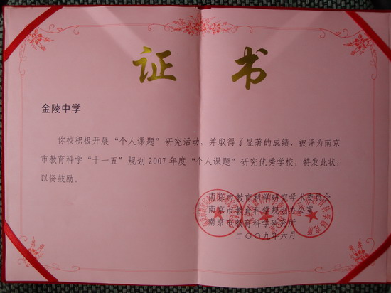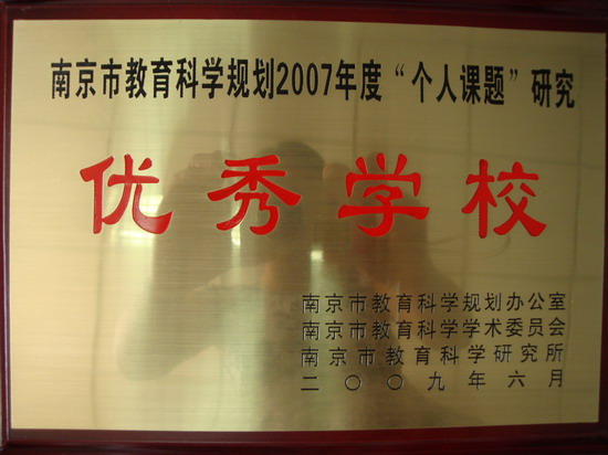 由于我校积极开展“个人课题”研究活动,并取得了显著成绩,被评为南京市教育科学 “十一五”规划“个人课题”研究优秀学校。