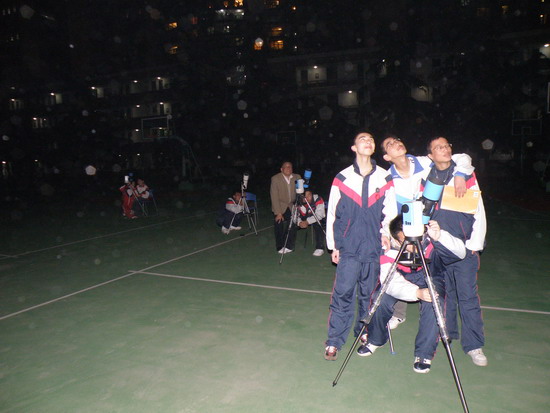 为纪念“400年前,伽利略第一次把望远镜对准星空”,2009年4月5日晚上在金陵中学作为合作伙伴参与了江苏省天文学会主办“国际天文年天文100小时”活动。地理组陈卫平、张昌宁老师放弃公休日,从南京大学借来了4架天文望远镜,组织我校高一学生和社会市民在我校北操场进行了观测星空活动。 地理组:杨伟大
