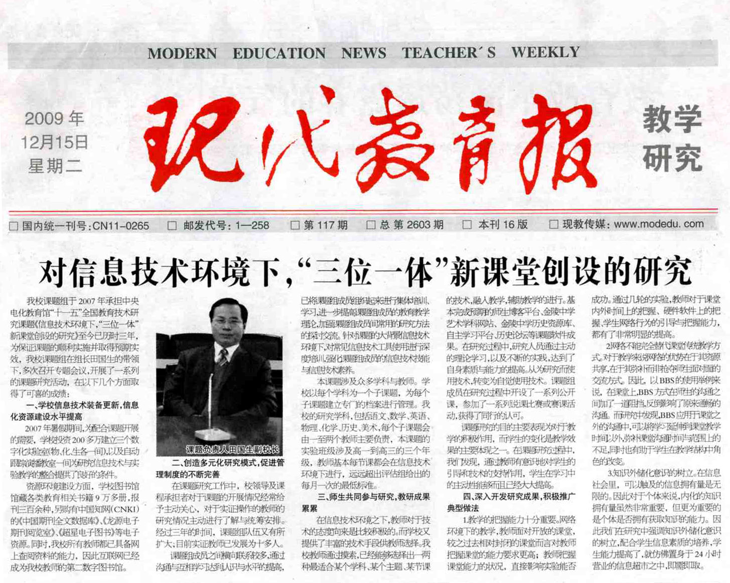 《现代教育报》报道我校《信息技术环境下,“三位一体”新课堂创设的研究》课题成果