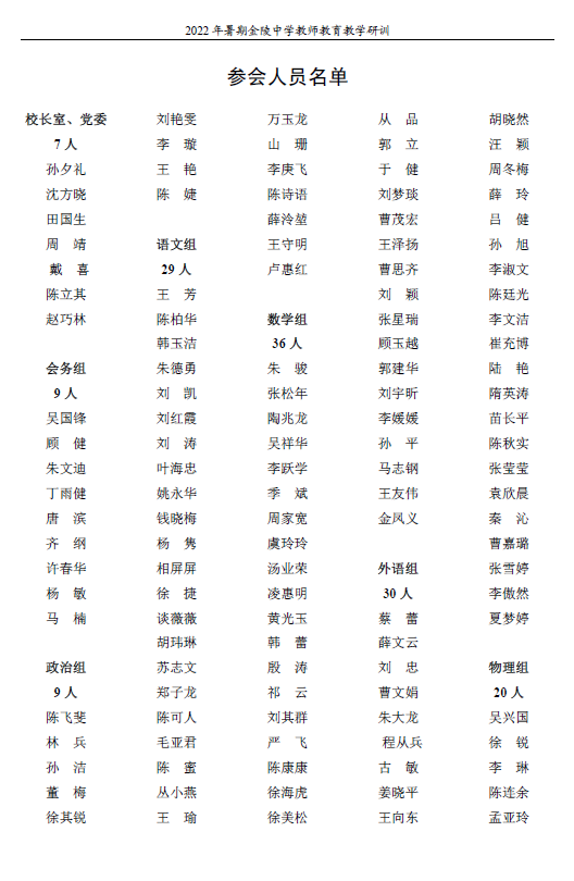 2022年暑期金陵中学教师教育教学研训参会人员名单