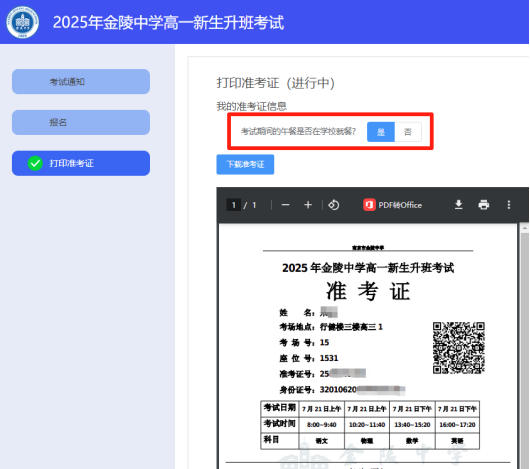 请根据通知打印准考证的开始日期于当日登录报名系统,点击左侧菜单“打印准考证”,在页面先选择就餐意愿,然后预览准考证信息,确认无误后点击“下载准考证”按钮,将准考证pdf文件下载到本地,然后进行打印。