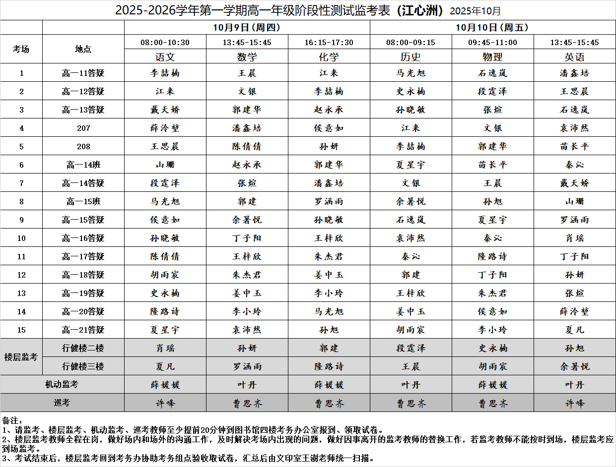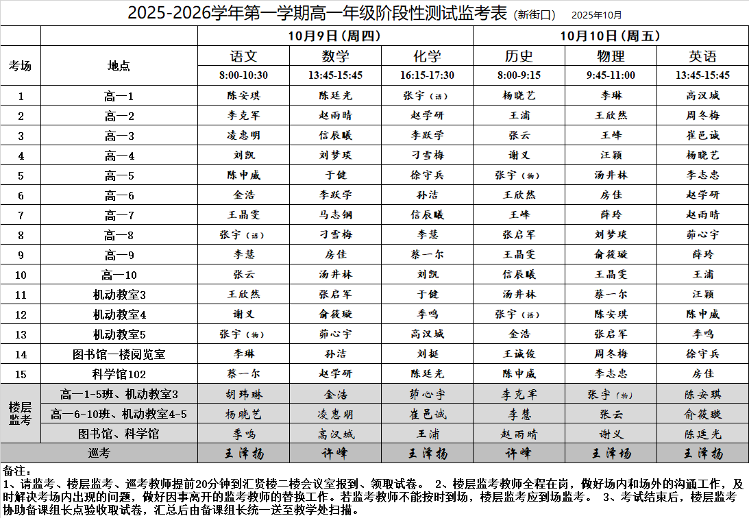2025-2026学年第一学期高一年级阶段性测试监考表