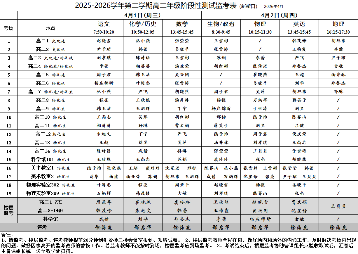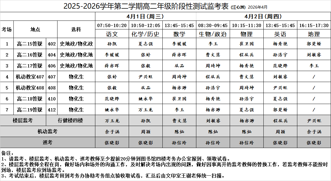 2025-2026学年第二学期高二年级阶段性测试监考表