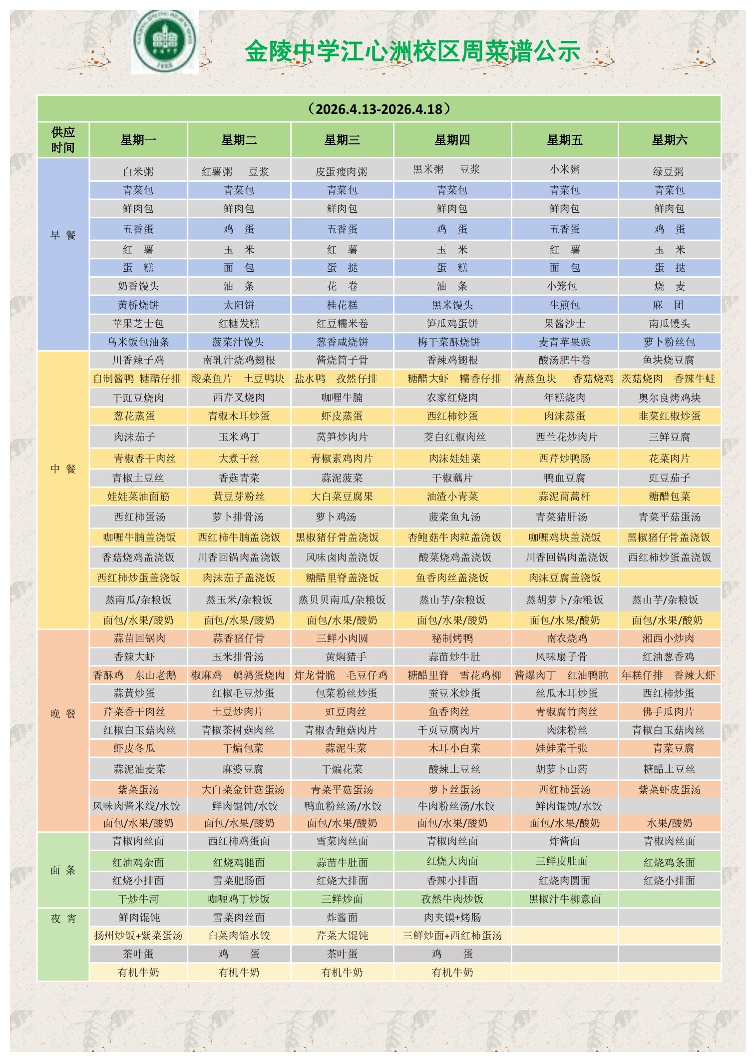 江心洲校区一周菜谱(2026.4.13—4.18)