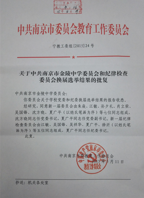关于中共南京市金陵中学委员会和纪律检查委员会换届选举结果的批复