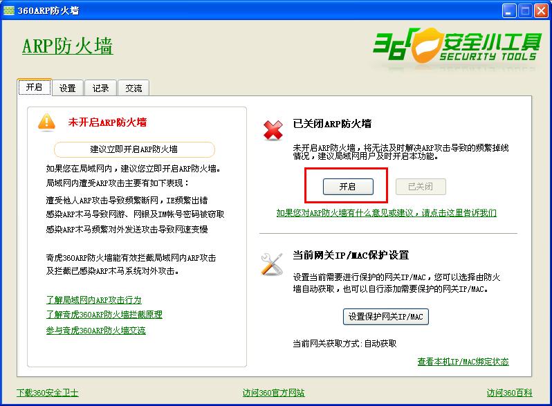 2、 安装完成之后,运行“奇虎360安全卫士”,切换到“保护”一栏,将“局域网ARP攻击拦截”功能开启,然后按提示重启电脑。