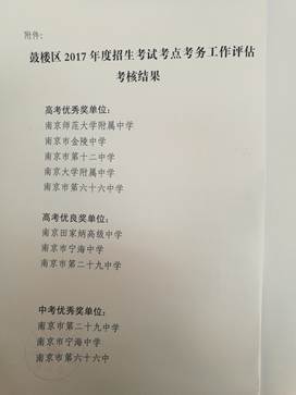 我校获得“鼓楼区2017年度招生考试考点考务工作评估考核高考优秀奖单位”称号;