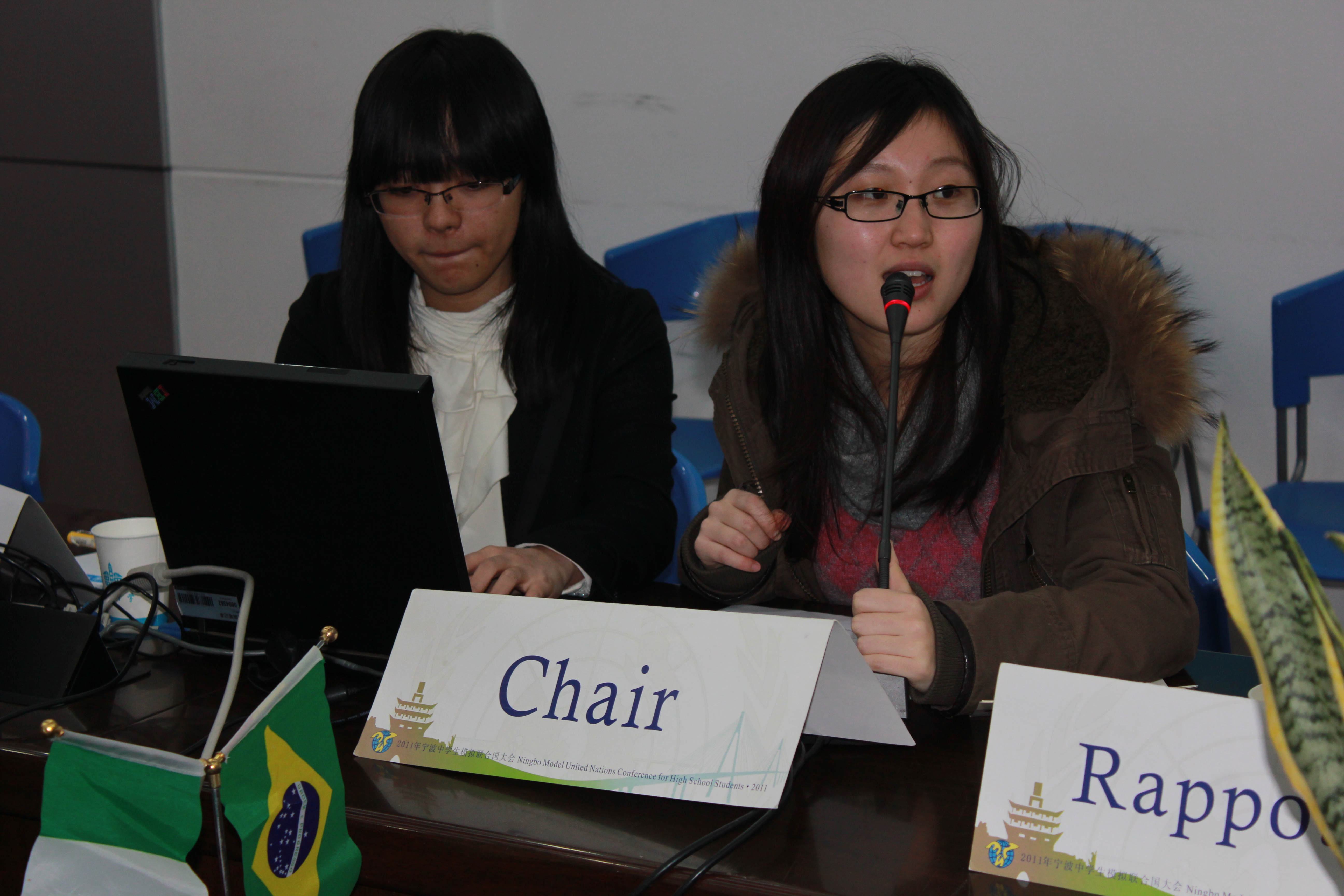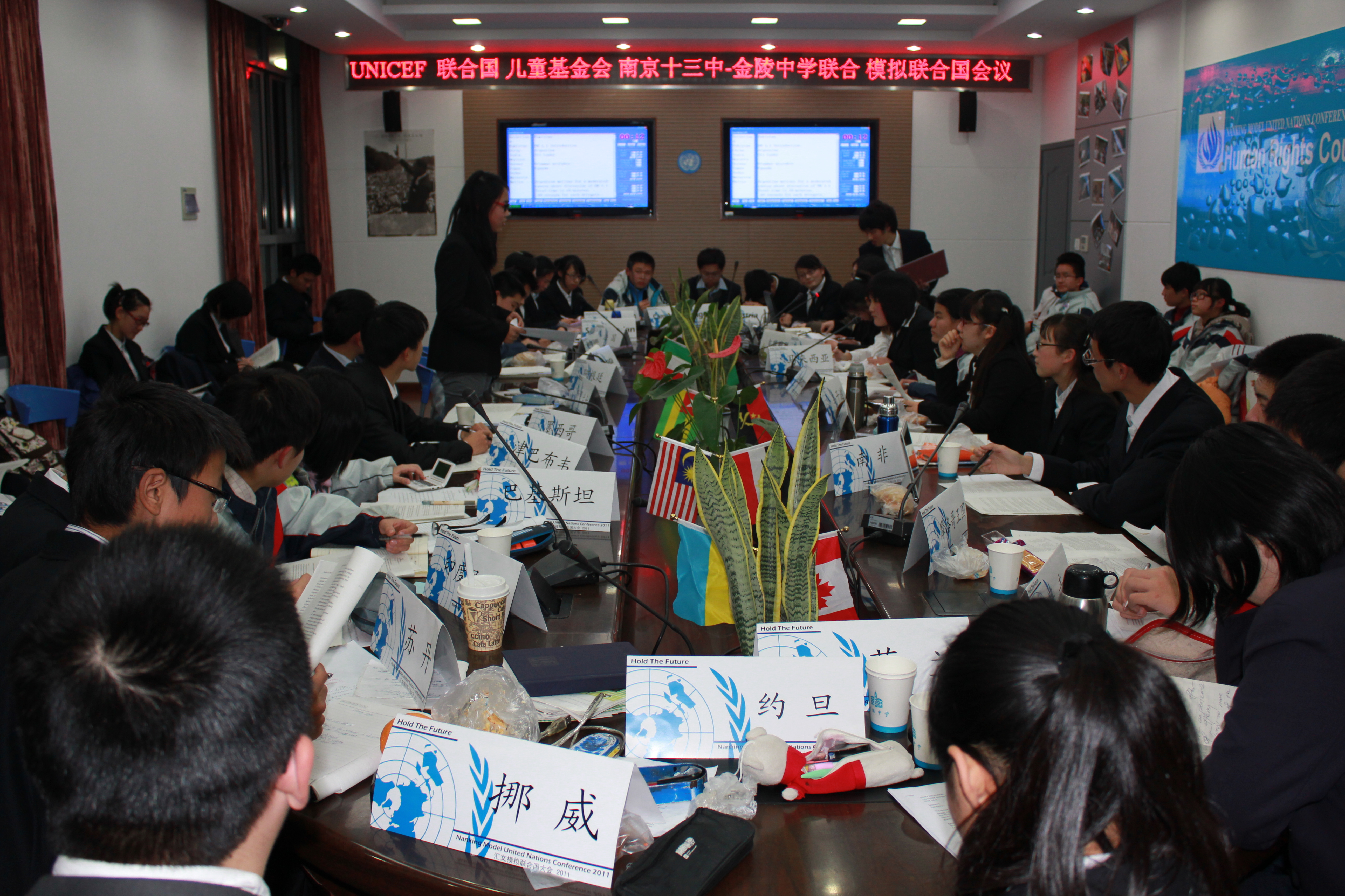 “君子以文会友,以友辅仁。” 2011年12月2日至12月16日每周五下午的四点半到八点半,由金陵中学模拟联合国社团主办的“南京十三中—金陵中学UNICEF儿童基金会模拟联合国会议”在金陵中学模联会议室顺利召开。担任主席的是有多年模联代表、主席经历的南京大学孟衎衎,杰出校友南京审计学院高宇捷,南京大学张世界,助理是赵义雪莹,周张祎,徐兆伟。南京师范大学査霄飞、郭嘉、周文韬担任了会议进程的摄像、拍照工作。从会前立场文件的写作,到会场上的针锋相对,代表们在展现个人风采之余,既体现了对模联活动的热情,也充分展露出了外交官的潜力。
