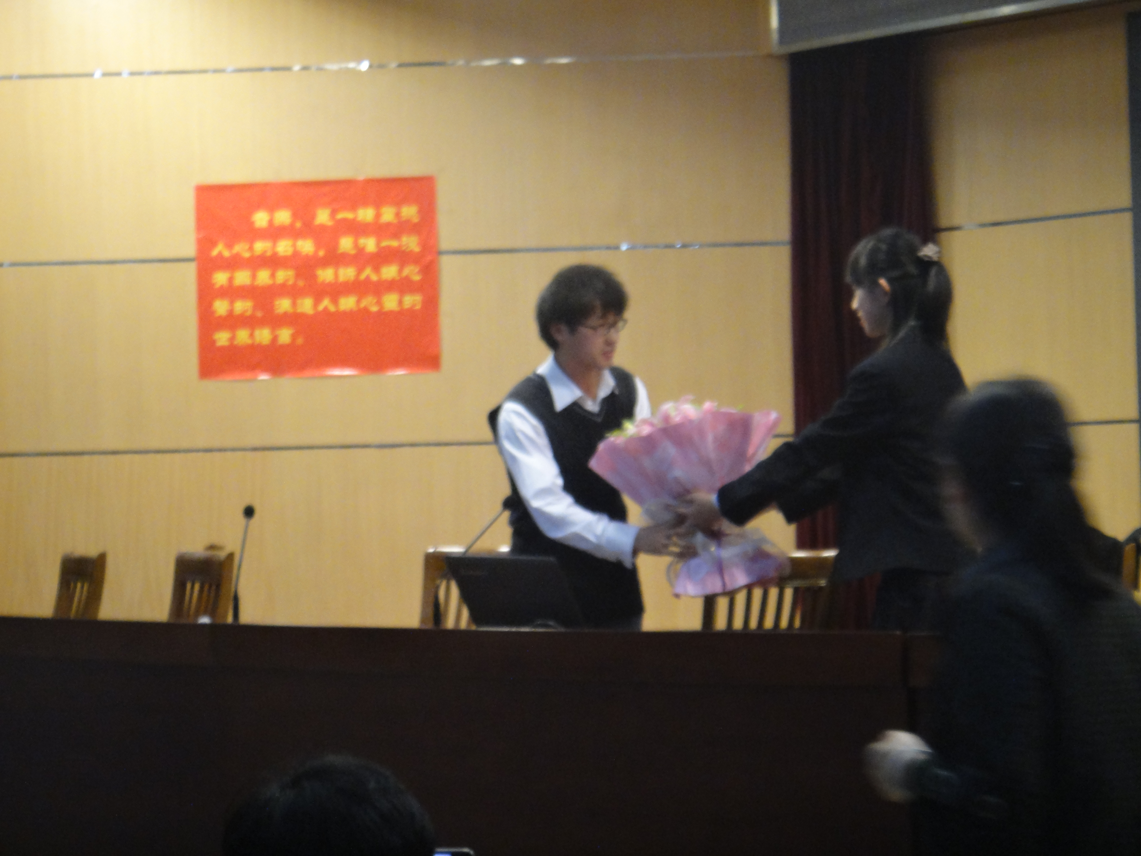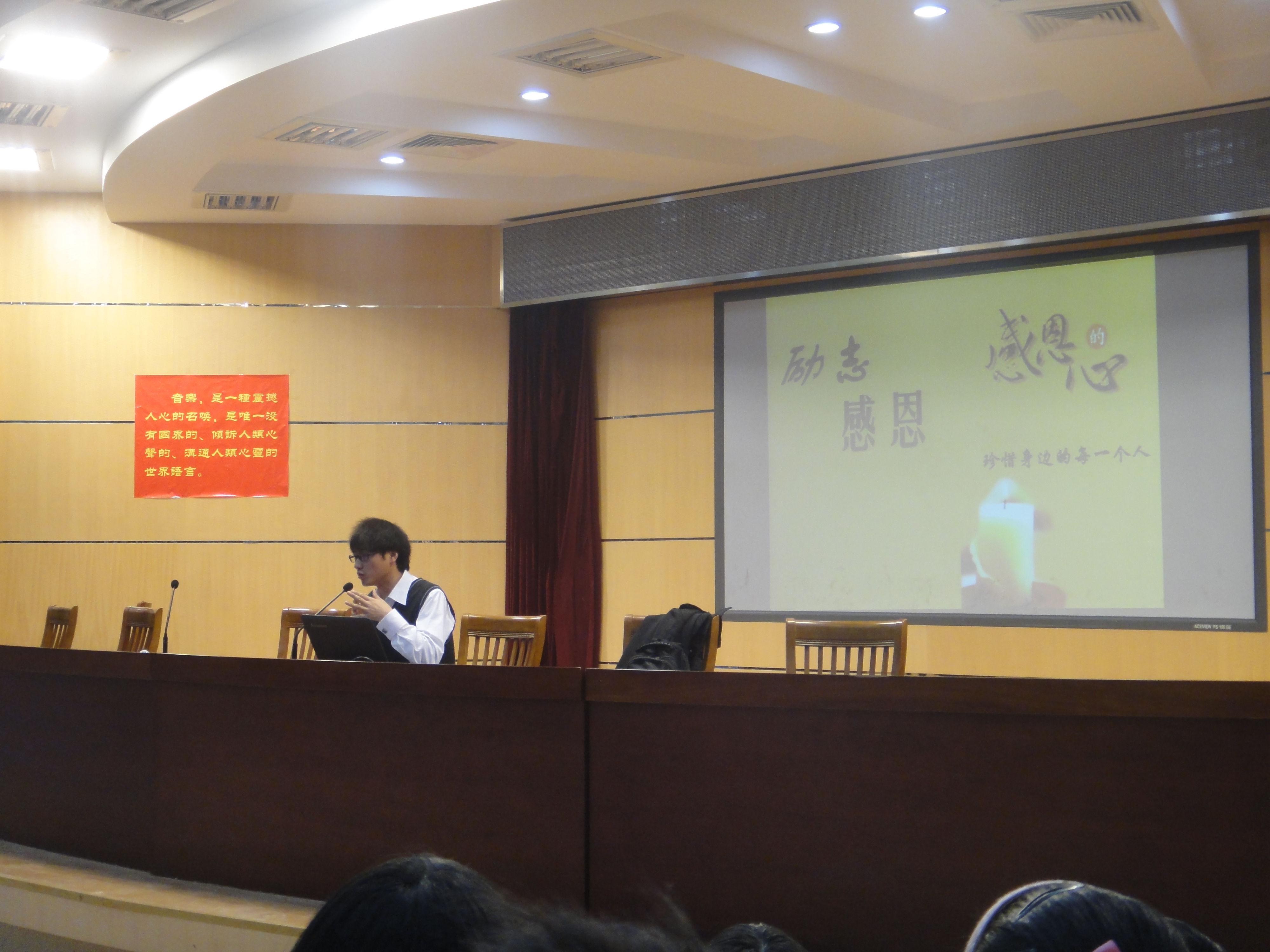 2011年十一月三日下午,高二(5)班实习班主任赵久龙老师在科学馆报告厅为全体高二同学作有关“感恩·励志”的报告。赵老师以“苔花如米小,也学牡丹开”这句诗开题。声情并茂的讲述了自身的励志故事,缅怀了已过世的奶奶。同学们听后感动异常。赵老师还描绘了令人憧憬的大学生活,鼓励我们努力学习,想着我们的梦想奋斗。