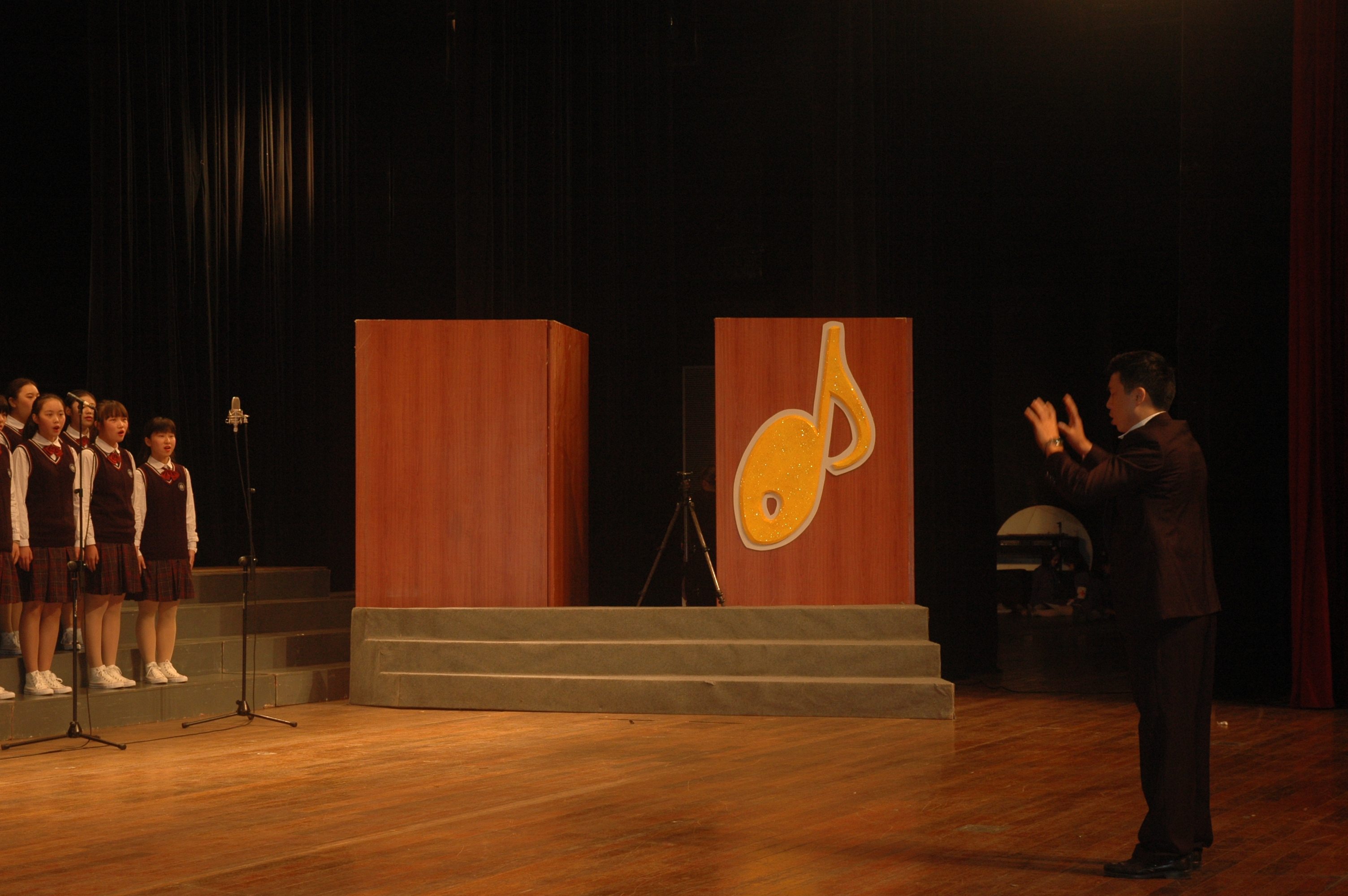在最终比赛的舞台上,我们金中学子展现出了自己的风采。当聚光灯照向我们的时候,当沈老师和伴奏毛晨昱同学登台的时候,我的脑子里不停地想着乐谱,哪里要渐强,哪里要跳跃,哪里的高音要处理好。当沈老师抬起手的那一刻,全场鸦雀无声。表演开始了,女低音精准沉稳的引子一出来,我仿佛立马找到了感觉一般。开了个好头!接着清脆嘹亮的女高,低沉有力的男低有序的铺陈开来,加上男高高亢的主旋律,共同晕染开了一幅浓墨重彩的沂蒙山水图。随着沈老师的手势高低,我们的旋律时而激扬澎湃,时而低回婉转,时而声势浩大,时而浅吟低唱。紧接着的《南屏晚钟》随着男高扎实有力的撞钟声,活跃轻快的旋律仿佛带领我们走进西湖畔的葱葱树林。轻快俏皮的旋律让人忘记了呼吸,让闪光灯忘记了闪烁。演出结束之后,前来观看的家长们都兴奋地说我们的《南屏晚钟》唱得太好了,女生们的动作也十分温婉且不失活泼。