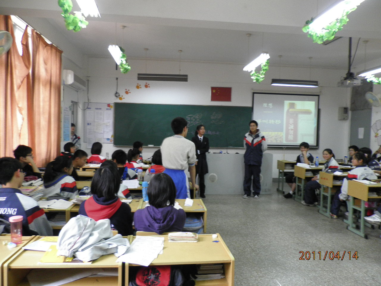 4月14日下午,高一(6)班以“理想”为主题召开公开班会,点面结合地剖析了理想与职业的关系,详细探讨了关于即将面临的文理分科的问题。在班委和全体同学的配合下,班会气氛热烈,班会形式新颖。测试题、小品等为班会增添了不少情趣,主持人风趣的语言也充分调动了与会同学的积极性,使现场的气氛轻松而热烈。我们作为新一代的青年学生,应该有明确的目标和远大的理想。这次班会,既是展现我班风采的平台,也是我们人生路上一次有意义的经历!