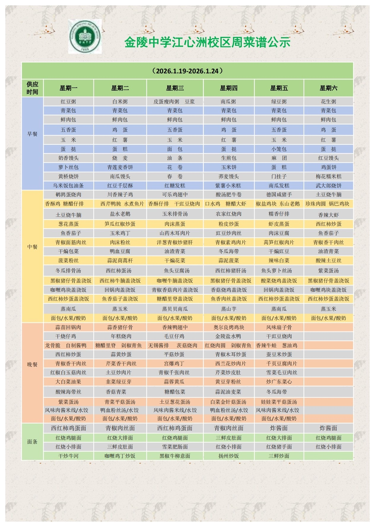 江心洲校区一周菜谱(2026.1.19—1.24)
