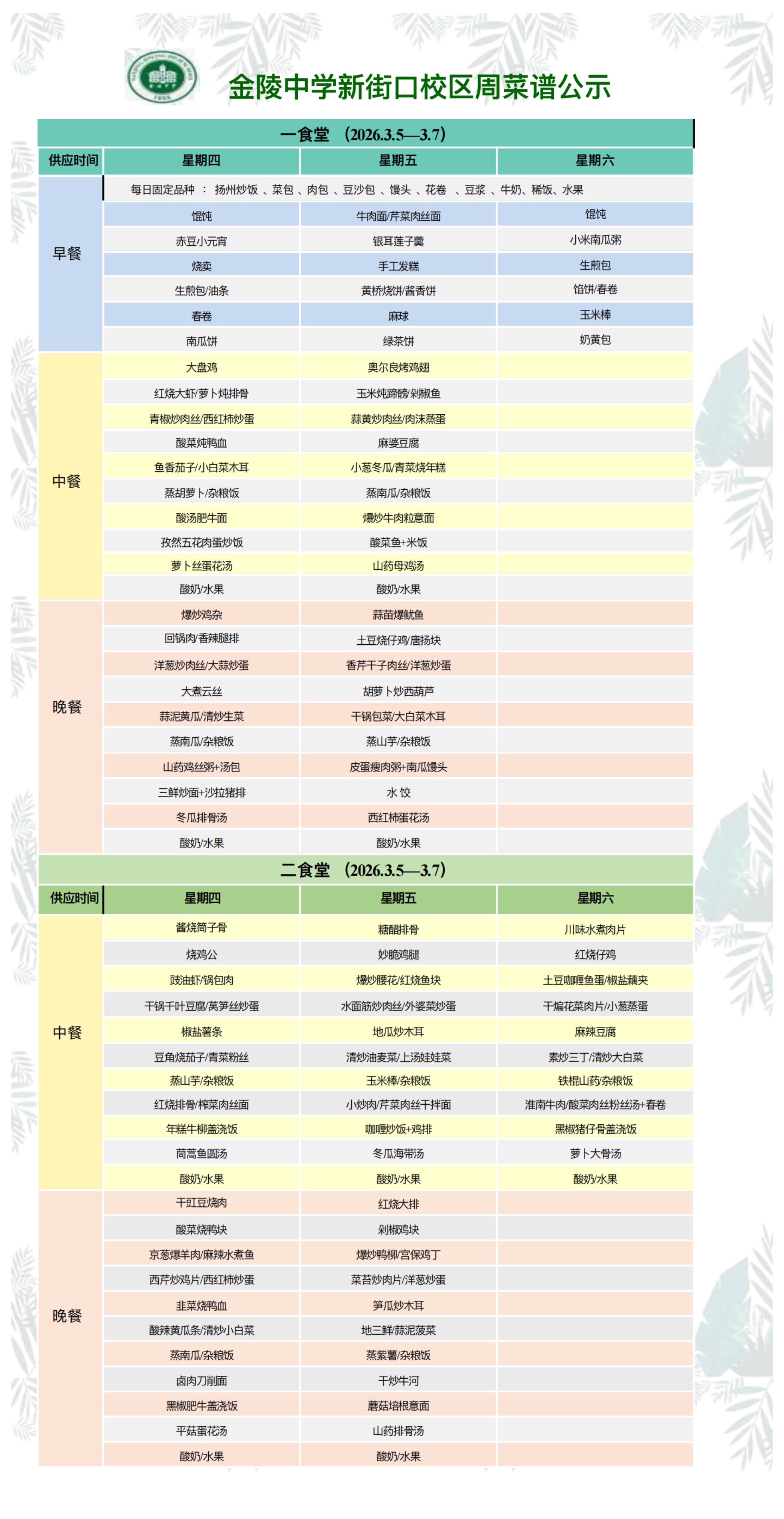 新街口校区一周菜谱(2026.3.5—3.7)