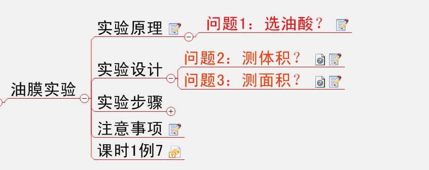 第三,在基于“油膜实验”的核心内容的知识梳理中,黄老师关注的是“实验原理”的剖析和“实验设计”的解读,复习过程中有序的呈现出如图3所示的界面中内容,依次提出若干问题而引领着学生的思维活动流畅的运行。