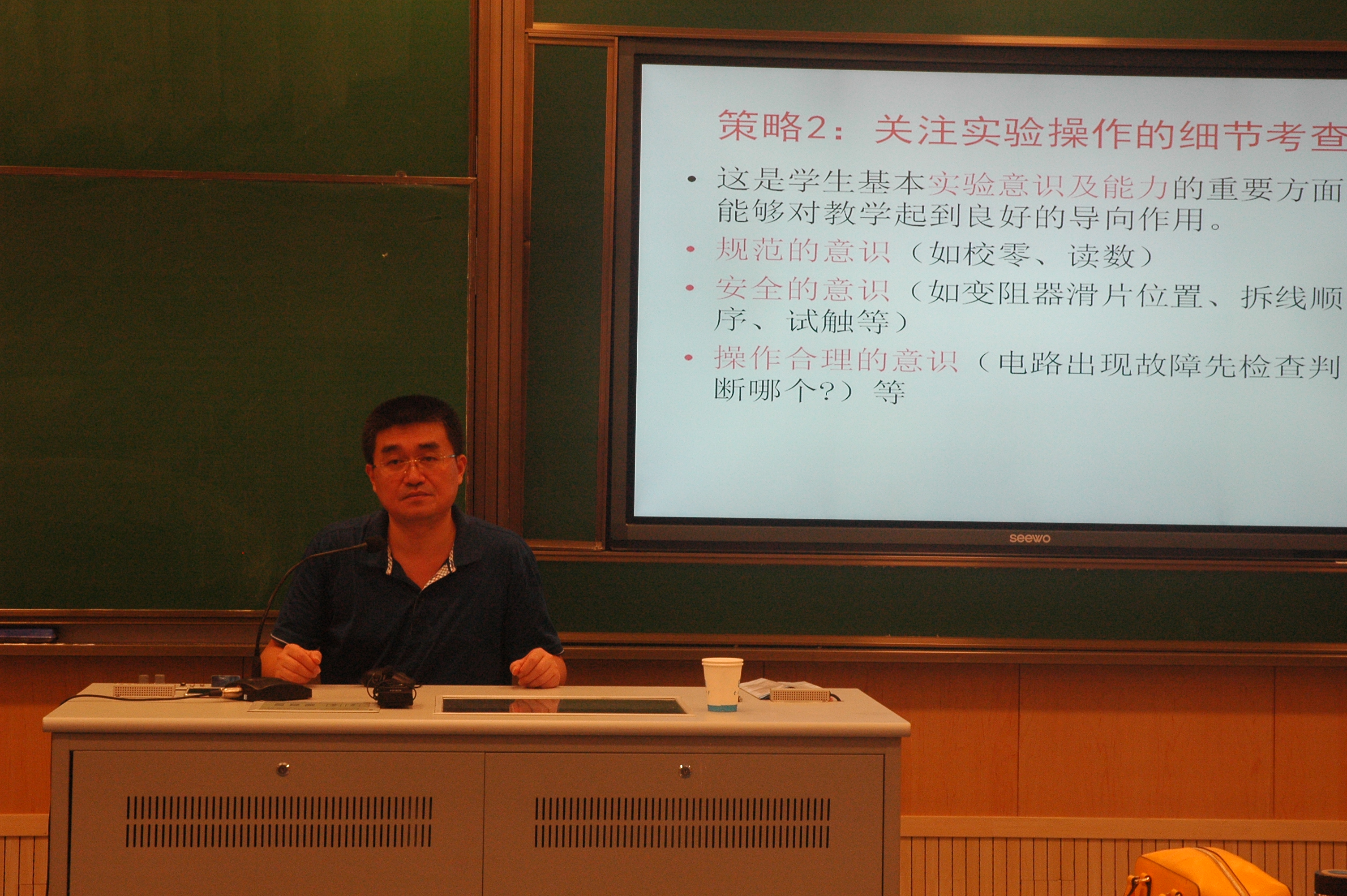 南师大仲扣庄教授作讲座《基于核心素养的高中物理实验教学》。仲教授告诉同学们,实验是物理教学之魂。王教授从百宝箱中拿出一件又一件的自制实验器材,令作为高中教师的学员们很是惊叹!覆杯实验的改进、简易电动机、静电感应、奇异鸟饮水、辉光球点亮日光灯管等等,让学员们明白了,要抓住学生的心,抓住物理之魂,就要研究实验,做好实验,用好实验。努力为学生的学习创设情境,为学生的探究创新提供温床。