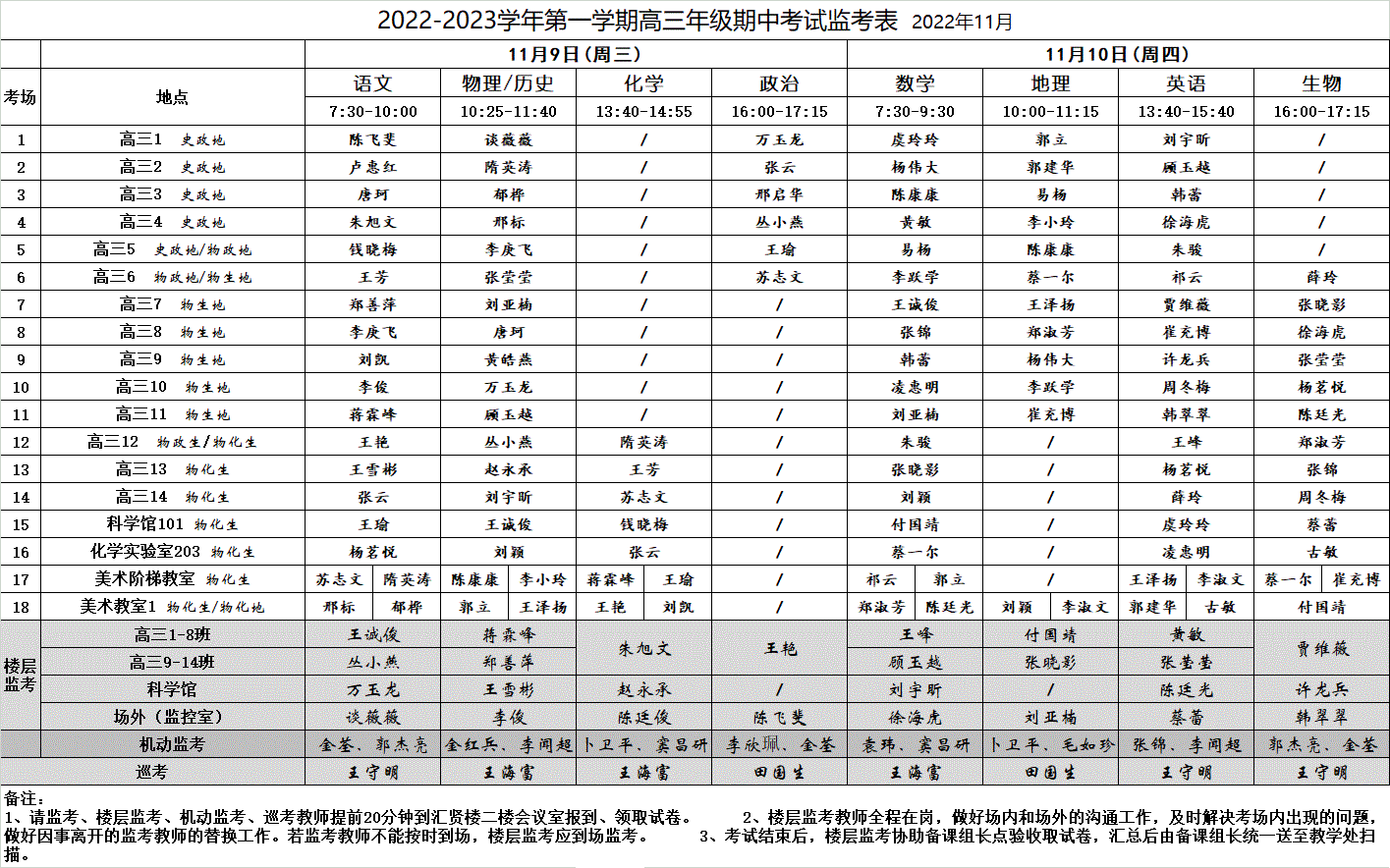 2022-2023学年第一学期高三年级期中考试监考表