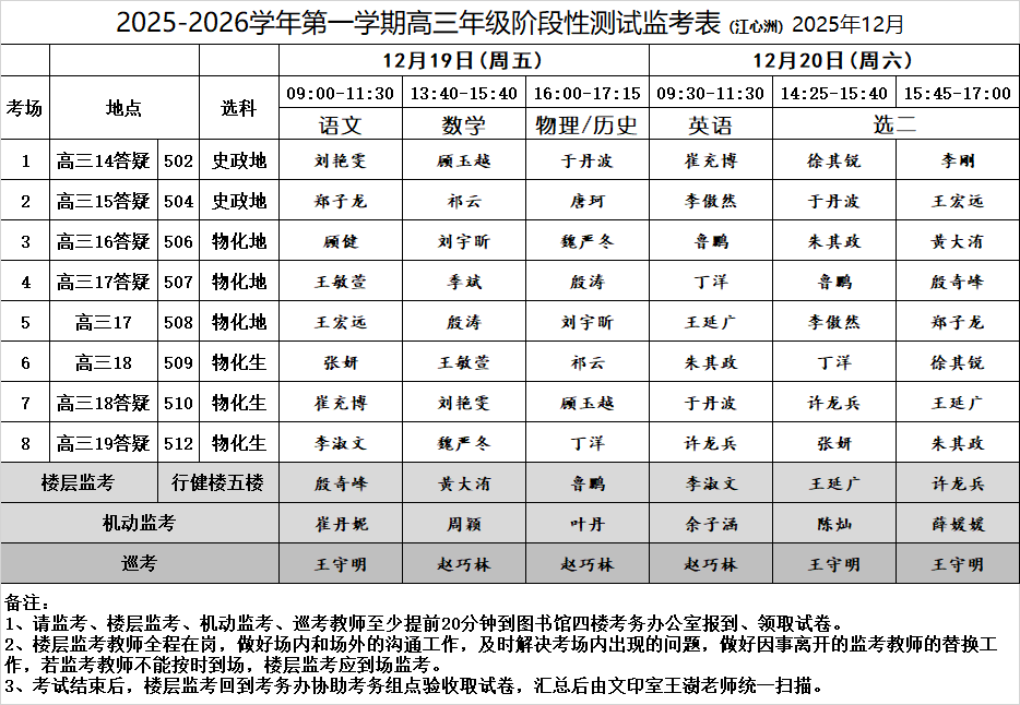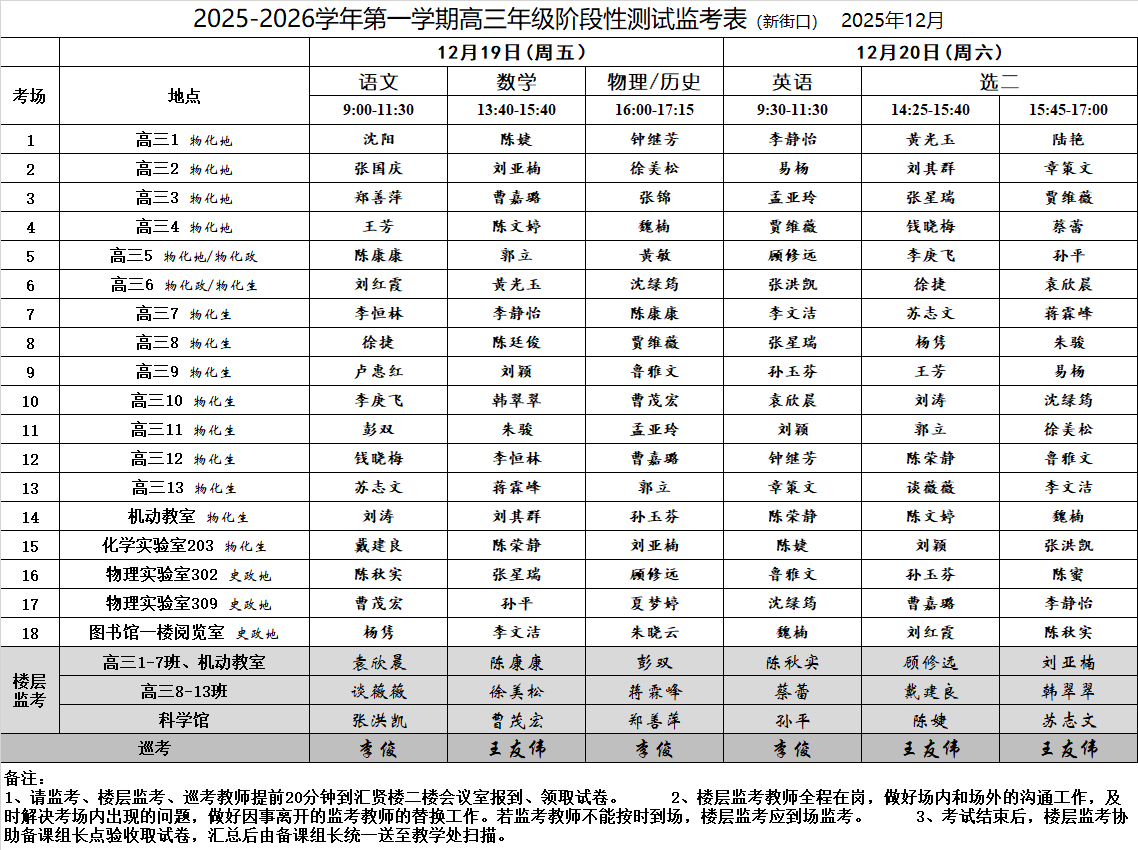 2025-2026学年第一学期高三年级阶段性测试监考表