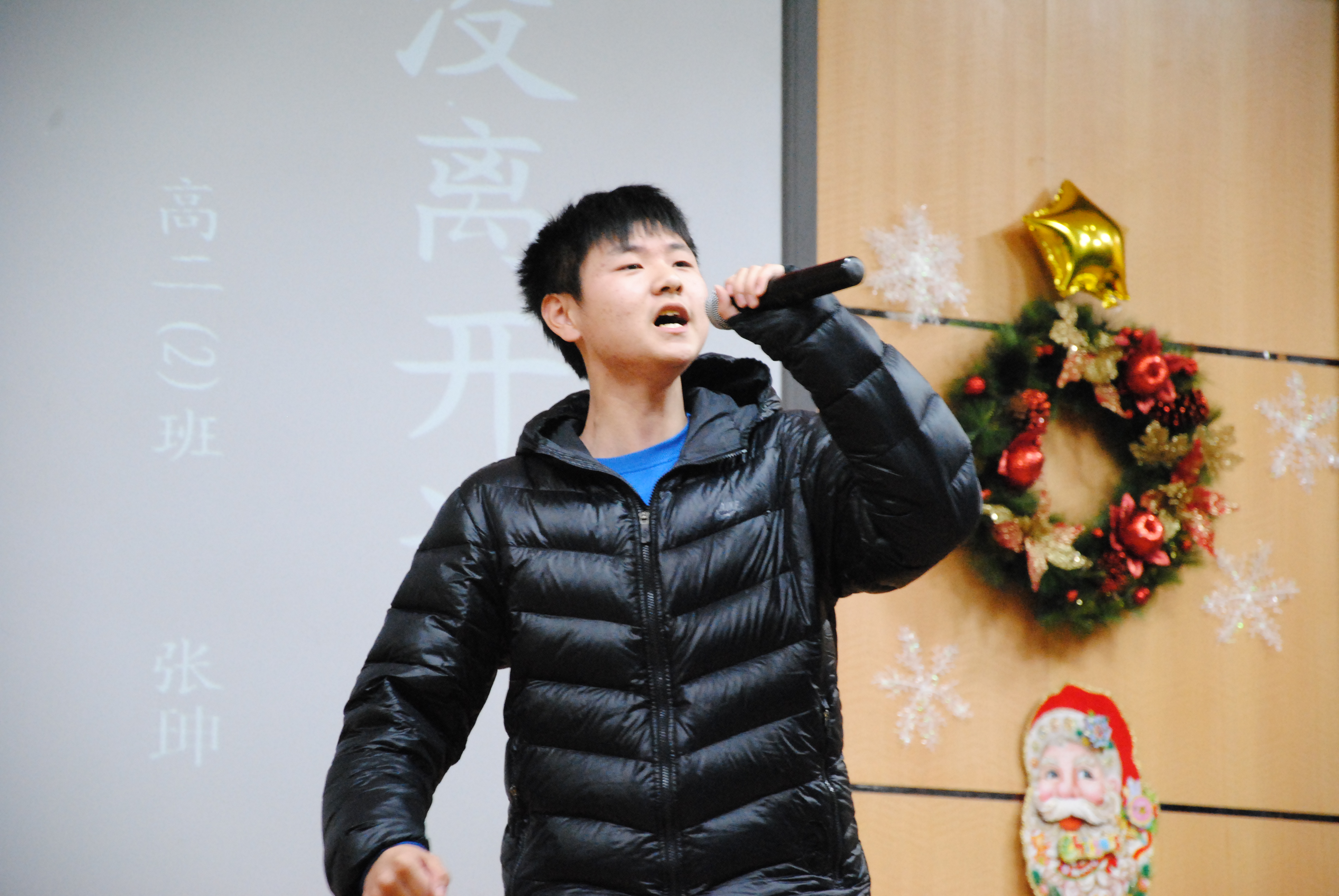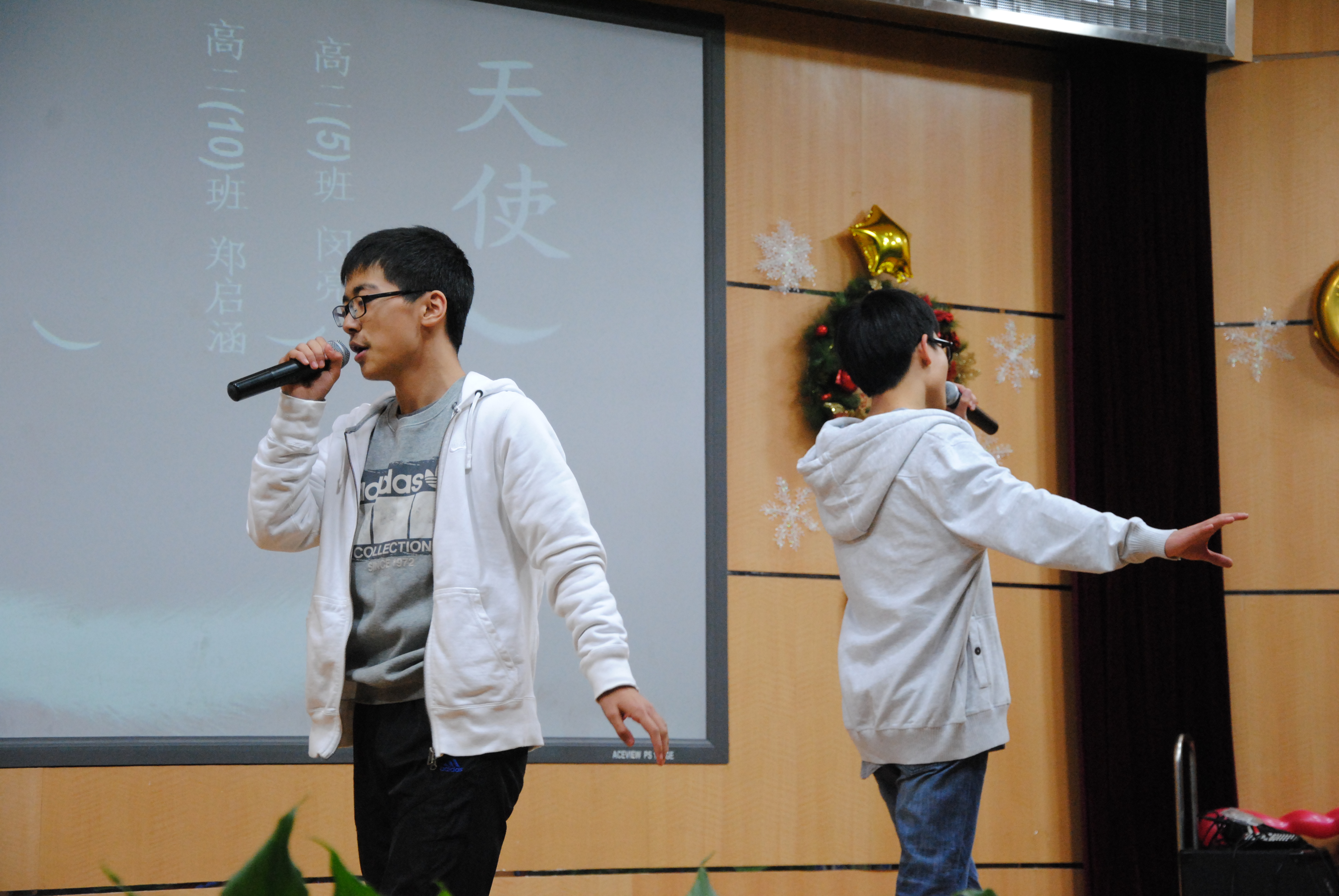 随着台下的一片掌声,高二(5)、(10)班的闵亮、郑启涵同学为我们带来了《天使》这首歌曲,台上的同学如“好声音”的选手般在尽情歌唱,观众们也目不转睛地注视着选手们的精彩表演。接下来的节目更是绚丽多彩,如繁花般迷住了人们的眼。有高二(2)、(4)班的李聃睿、陈浩同学的萨克斯歌曲《比爱更深的伤痛》,灰色的衣服配上萨克斯溢出的金属光泽,将人们拉入欧洲舞会的霓虹灯下;有高二(1)班姚继宗、文珏淇同学的《AMAZING GRACE》,优美的美声唱法如流水般绵长,又如阳光般温暖,带人们走进草野遍布的希腊爱琴海之滨;有高二(5)、(10)班的孙沁园、李鋆、徐嘉乐、苏博昊同学带来的《FOREVER 4》,穿着圣诞老人服装的他们以青奥会赛场中的热情,凭专业街舞演员的技艺将活动带入高潮,从他们翻飞的舞蹈中我们不难想见美食节表演的绚丽,有高二(1)、(6)班的刘宇红、卫星吉同学带来的《她说》,穿着自制卡通头像衣服的他们带领着我们回到过去的青春时光,回忆心中的那个“她说”;随着一段优美的钢琴前奏,穿着黑色羽绒服的高二(2)班张坤同学又凭着一首《没离开过》,将我们带入了内蒙古风吹草低见牛羊的草原,苍茫的歌声如雄鹰般划破天空的寂静;全场最耀眼的一颗星要数高二(6)班的严心汝同学,一曲《吴歌》如红色的水滴在白色的宣纸上渲染开来,席慕容说过:“爱像水墨青花,何惧刹那芳华。“青花尚且有一隅芳华,更何况《吴歌》中那一袭红衣、那一抹艳色。如蝴蝶般带来春意的盎然,如流星般带来耀眼的光芒。接下来是高二(3)班、高三(9)班的葛寅睿、董超同学的口琴表演《数码宝贝》,琴声为同学们编织出一场童年的梦幻,忆起儿时每晚八点守在电视机旁半小时的精彩时光,铭记的是童年的欢欣和愉悦。最后是高二(7)班、剑桥高二(2)班的茅舒妍、陈秋睿、孙彤、耿鹏琪同学带来的《爱与思念是我的温柔》,随着他们的歌声,我们仿佛漫步在台湾下午阳光普照的街道上,路边咖啡店中淡淡的咖啡香气阵阵飘过;又仿佛漫步在厦门海边,伴随着鼓浪屿的琴声,感受着海风拂过面庞的优柔。