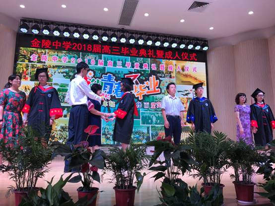 2018年6月23日,金陵中学2018届高三毕业典礼暨成人仪式在科学馆报告厅举行,本届毕业典礼的主题是“我的青春不毕业——为梦想而年轻,为责任而坚定”,我校全体高三年级学生和家长、任课老师及学校领导出席了本次活动。 上午8点30分,伴随着悠扬的校歌和鲜花,在家长们的目送下,各班同学按照顺序依次踏上红毯走向会场。 此时,典礼现场的屏幕上正播放着学生会拍摄的纪录片《告别时刻》,记忆一下子被拨回到备战高考的日子,无数个不眠的日日夜夜、一个个许下的誓言、一道道攻克的难题,仿佛就在昨天。钟声响起,13位毕业生走上舞台,演唱起由徐逸凡同学创作的歌曲《听见·钟声》,“这钟声听罢千遍万遍,迎来清晨似昨天。暂搁纸笔,背上行囊,这一天我将与你告别……”顿时,同学们的眼眶湿润了。 典礼主持人由迮家伟同学担任,他庄严宣布毕业典礼开始,奏唱国歌! 首先,孙夕礼校长致辞。他叮嘱毕业生要永葆进取之心、坚守责任之心、常怀感恩之心。同学们走进学校,是金中的学生;走出校门,永远都是金中人。他还提醒同学们,记得常回家看看。紧接着由教师代表孙凯老师发言,他风趣地谈起上课时对学生的管理。也许只有到了毕业以后,同学们才会舍不得那些偷偷玩手机看漫画的时光,他希望同学们不要忘记刻苦学习的日子,永远坚持良好的学习习惯,懂得约束自己。随后,学生代表梁逸秋同学发言,他说:“金中是我们每个人心中的象牙塔,我们在这里收获了最真挚的友谊,最真切的教诲,最珍贵的人生哲理。这些美好的时刻已经深深烙在了我们的心里,多年后不管身处何地,记忆终将永恒。” 观看视频《我们的十八岁》是每年毕业典礼的保留节目,十六位高三老师回顾了自己的十八岁,并为现在十八岁的毕业生提出了展望。接下来进行的是感恩父母环节,四位毕业生的家长讲述了他们与孩子之间的故事,情到深处,彼此都流下了激动的泪水。赵语涵同学带领全体高三毕业生宣誓,在鲜红的国旗的映衬下,同学们举起右拳庄严宣誓。郑钧喆同学代表毕业生向母校赠送了礼物。 随后,学校领导、特级教师、教授级高级教师向学生拨穗、颁发毕业证书。 当大家观看完傅华洋同学导演的视频《一起走过的日子》时,就到了本届毕业典礼最激动人心的环节。屏幕画面忽然切换到场外,直播镜头跟着两位同学的脚步,从校园走到会场,从幕后走到幕前,此时全场都沸腾了。戴文韬同学和周蕴晗同学举起一张毕业请假条,对孙校长说:“2018届毕业生毕业时间为2018年6月23日,返校时间不定期,请您批准!”孙校长郑重签字。 “桃李做春风,永为南国雄。”伴随着铿锵有力的校歌,毕业典礼圆满结束。 感恩学校,感恩老师,感恩父母,感谢同窗,更要感谢自己。这一天注定是让人铭记于心的日子,因为你们不再是父母臂膀下的雏鹰,而已经成长为一个独立的人,你们即将离开母校,奔向更广阔的远方。当人群散去,一切归于平静,你们毕业了,但你们最好的年华会一直留在这里,永远焕发青春光彩。毕业,是一段时光结束,更是未来生活的开始,希望每一个金中人要有青春梦想,更要有社会担当! 关于本次毕业典礼的各个流程,学生工作处的老师和团委学生会的成员都进行了反复打磨和精心设计。在此感谢为毕业典礼默默付出的全体老师、同学和后勤工作人员,你们辛苦了! 金陵中学学生处 高三年级部