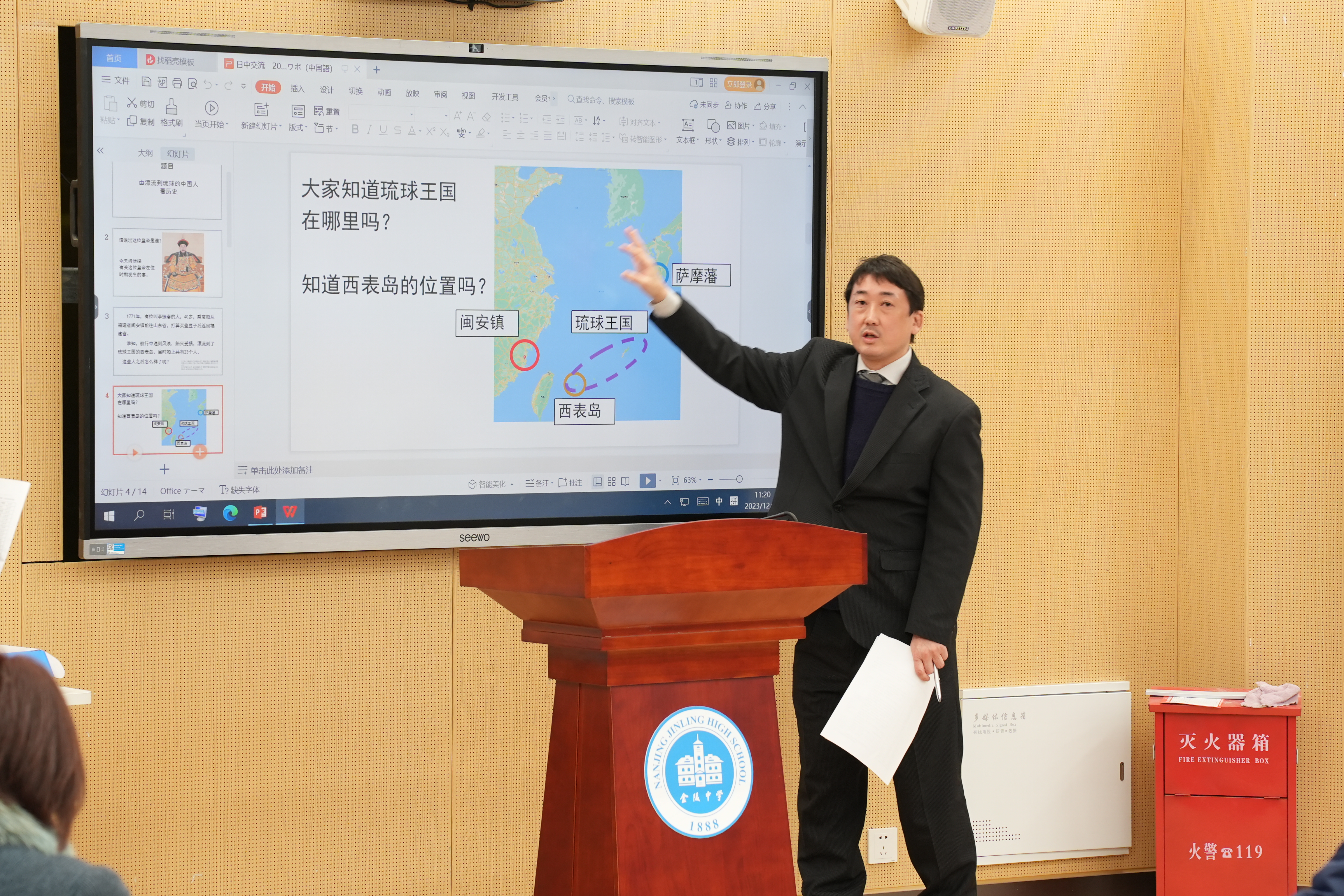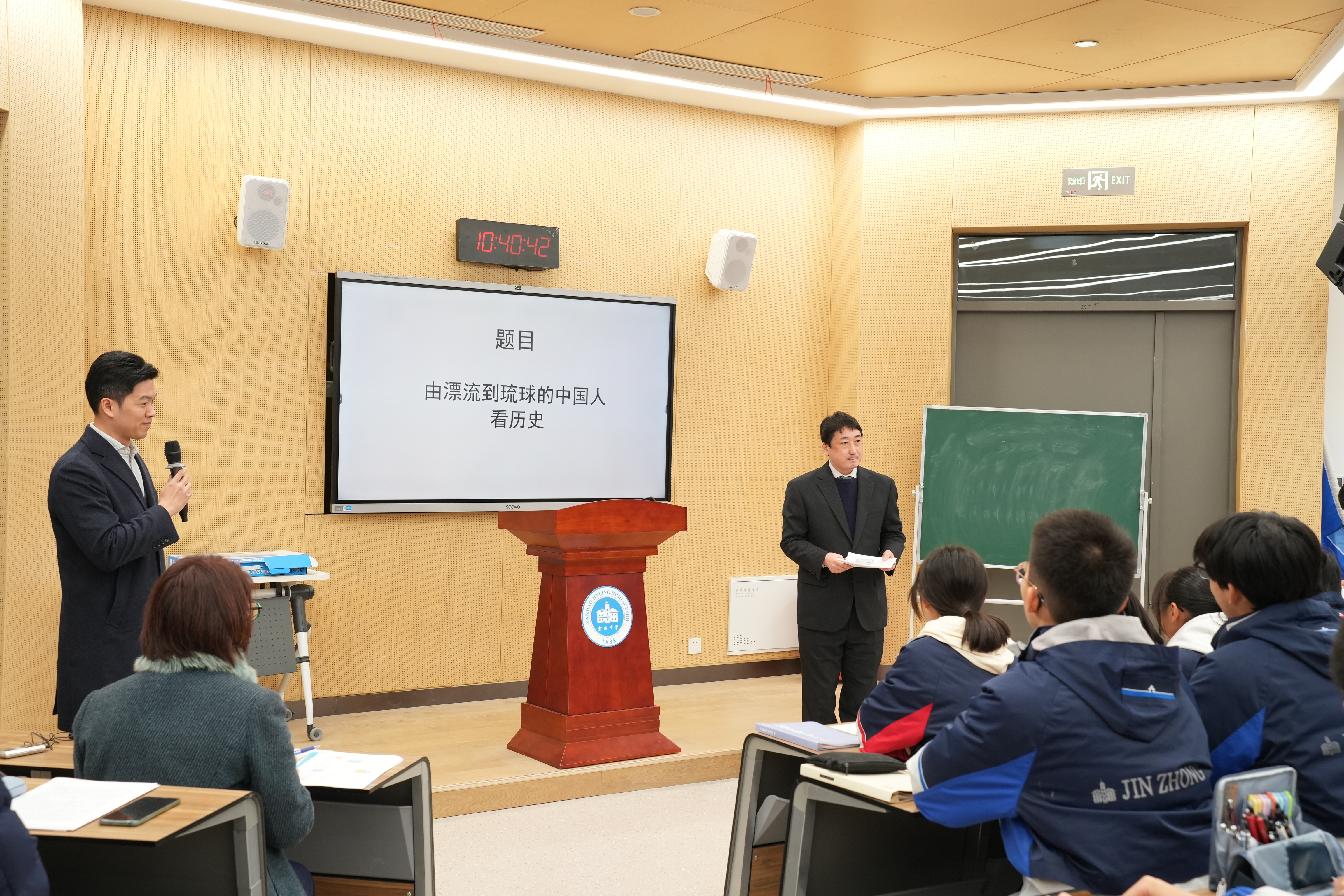校园参观后,双方进入到此次交流活动中的重要环节——中日两国历史教师同台上课。我校青年老师于丹波的课题是“关于第二次世界大战的历史记忆”。于老师缅怀过去,立足当下,展望未来,得到中日听课教师的一致好评。日方渡边哲郎老师的课题是“通过考察漂流到琉球的中国人来思考18世纪中国•琉球•日本三者之间的相互关系”。授课中,渡边老师以小切口着眼,通过史料阅读引导学生走进历史情境,鼓励大家提出问题并尝试解答,课堂的代入感让人很有启发。