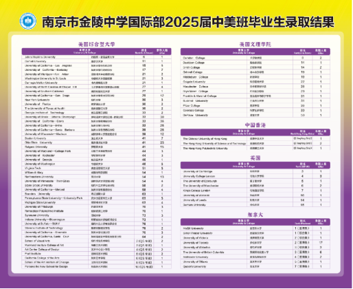 历经17载耕耘,中美班硕果累累。众多毕业生凭借卓越实力,叩响世界顶尖学府之门。在美国,他们成功踏入哥伦比亚大学、芝加哥大学、西北大学、加州大学洛杉矶分校、加州大学伯克利分校、杜克大学、康奈尔大学、约翰霍普金斯大学、范德堡大学、莱斯大学等顶尖综合性大学;卡尔顿学院、戴维森学院、明德学院、瓦萨学院、格林奈尔学院、科尔比学院、史密斯学院、哈维穆德学院等顶尖文理学院;以及帕森斯艺术学院、芝加哥艺术学院等知名艺术院校。在全球范围内,英国G5名校中的剑桥大学、帝国理工学院、伦敦大学学院、伦敦政治经济学院;加拿大医博类排名前三的麦吉尔大学、多伦多大学、英属哥伦比亚大学;还有日本、澳大利亚、中国香港地区的众多名校,都向中美班学子递出橄榄枝,充分彰显了金中中美班的卓越育人成效。