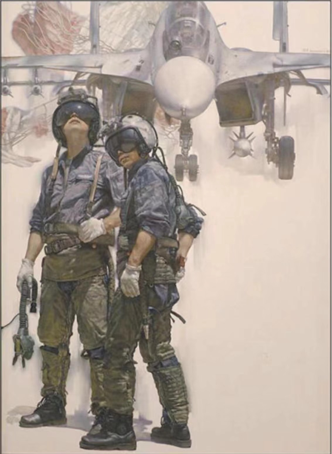 《和平使命》这幅油画作品描绘的是空军官兵战备训练的场景:万里长空,传来响彻云霄的轰鸣,歼击机尾部拉出道道白烟;伴着尖利的呼啸声,一架架歼击机返航归来;强烈阳光下,迎面而来的战机,机身闪亮刺眼,机翼上的铆钉闪着寒光;减速伞的伞花绽放出变幻莫测的艺术美感。作品努力从日常训练的角度诠释当代中国军人的精神特质,以古典写实油画的技法,细腻描绘全副武装的歼击机飞行员。在此基础上,作品背景用凝练手法留白出抽象的几何构成,间有晕染开的东方水墨韵味。迎面而来的战机,金属的机身闪亮而刺眼,机翼上的铆钉闪着寒光。飞行头盔、氧气面罩和枪械的碰击声,似一首矢志奋斗强军风采的奏鸣曲。