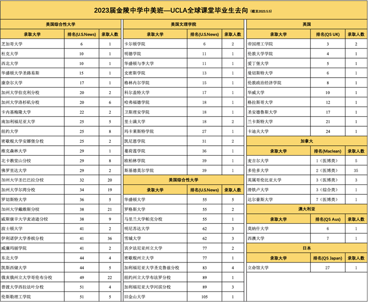 截至5月5日,中美班57名毕业生共收获297枚offer,其中美国方向offer 221枚、其他方向76枚。美国方向32%被排名前20的学校录取,49%被前30学校录取,79%被排名前40录取,95%被排名前50的学校录取。英国方向G5名校帝国理工学院、伦敦大学学院、伦敦政治经济学院等,以及加拿大医博类排名前3等优秀学府的offer,再次证明中美班学生扎实的学术功底和突出的综合能力。
