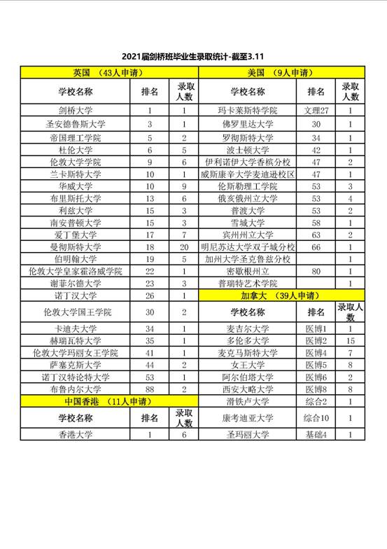 剑桥班:今年剑桥大学连续第四年向我们的学生发来了录取通知。中心成立以来英国帝国理工学院录取的学生已累计达30多人,伦敦政治经济学院近20人,伦敦大学学院100余人。英国G5名校的录取率近70%。加拿大这几年医博类前三的大学录取比例近年来都维持在95%左右。近年来美国方向的录取结果也愈加稳定和出色。2020年排名TOP50学校的录取率更是首次达到了100%。除上述申请国之外,我们还在澳大利亚、新加坡、日本、瑞士、德国以及中国香港等国家和地区取得了丰硕的成果。