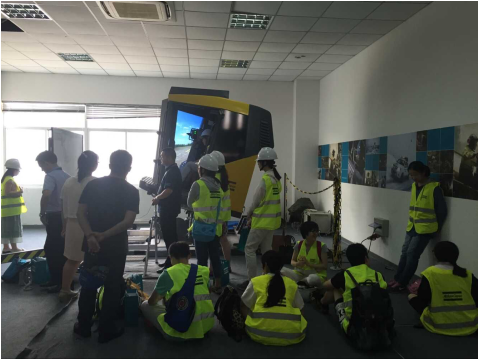 接着同学们终于可以有机会实地考察工业企业,近距离接触车间以及研发中心。秉承安全第一的宗旨,公司给每位同学及老师配备了安全帽和安全背心。同学们排队依次穿上醒目的黄色背心,互相帮忙配戴上安全帽。看着不同生产线上组装的各种地上地下矿山与岩石开挖设备,看着大型设备一步步组装完成,同学们惊讶又激动,最后忍不住纷纷爬上了重几十吨、价值几百万甚至上千万人民币的成品设备。在此过程中,所有同学都遵守公司规则,没有踏入黄线危险区。车间内禁止拍照的哟,所以小桥也乖乖遵守规章制度了呢~