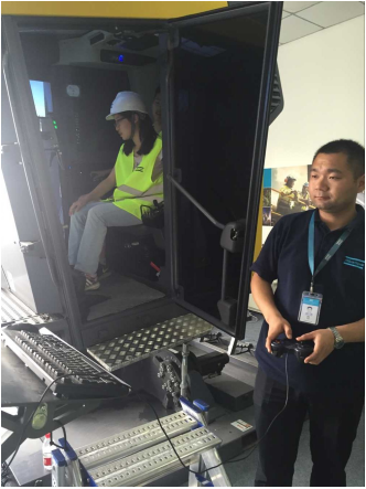 最后可是重头戏——产品模拟操作。学生们可以坐进1:1真实还原的驾驶舱内,体验驾驶各种设备,驾驶舱会根据遇到的路况上下左右颠簸,更有可能侧翻。驾驶舱可以容纳3人,所以同学们自愿1-3人分别进行模拟操作。模拟设备技术先进,操作起来仿佛打3D游戏一般。一个项目完成后,系统会自动打分,高三的莫嘉轩同学甚至得到了满分100分哟!当然也有同学遭遇了翻车事故,甚至是故意翻车...同学们各个兴致盎然,由于时间有限,没有参与的同学只能用羡慕的眼光看着驾驶室里的同学们了。在操作训练室里,咱们进行申请,经过特批,允许老师们拍了几张照片。