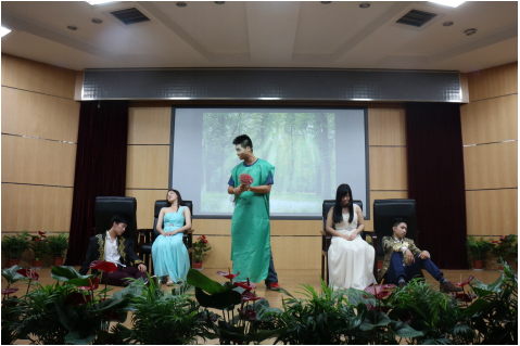 作为本场活动的主持人,当我站在舞台中央时,我的脑袋快要接近真空状态。不过,我始终谨记着老师的指导:将舞台上的鲜活的角色、情感传达给观众。有了唱歌同学的热场,到话剧表演时,现场的气氛已经变得很热烈了。从舞台帷幕拉开的那一刻开始,报告厅开始变得格外安静,所有人的目光都投射在舞台上。戏中有笑点时,观众们也在笑;戏中流露出真挚的感情时,观众们也都凝视着演员们。那些原来只停留剧本上的角色开始变得有血有肉,被我们演绎得淋漓尽致、有棱有角,我们每个人都在以自己为模型勾勒着这些缺一不可的人物。这些我们曾经并不确定能达到的目标,在正式演出时,一个个地被实现了。当最后一句台词说完,演员们走下台时,我突然才有了话剧要结束了的实感。这个历时大半个学期的活动居然现在要与我们告别了。我开始凝望着舞台、观众以及我身边的演员们,不知不觉之中视野里竟有了光晕,眼前的事物也有些模糊。我觉得很幸福,也有几分悲伤。